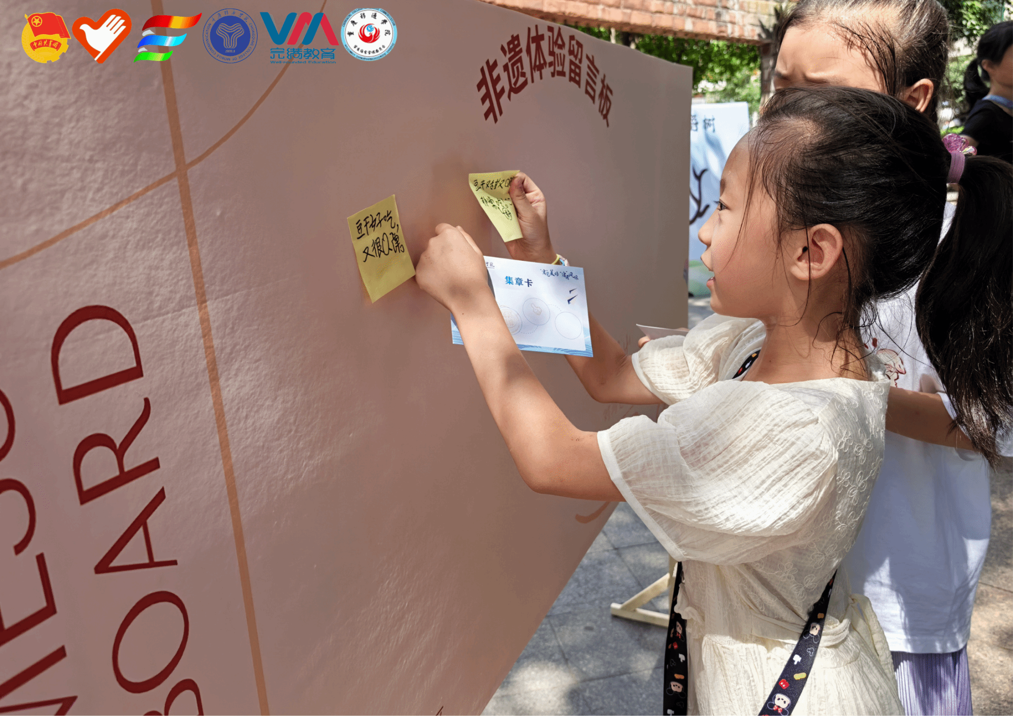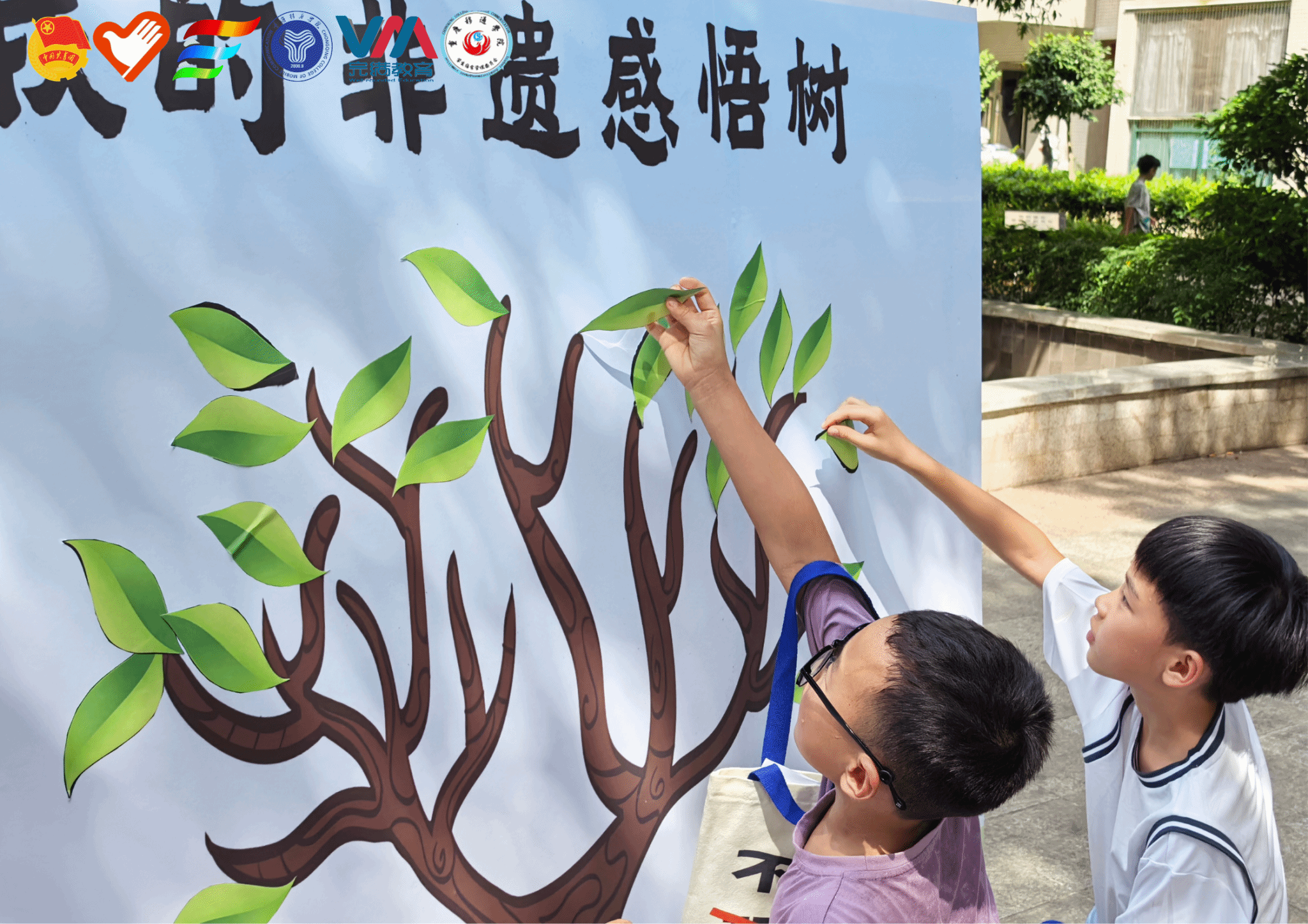 “解锁非遗脸”创意区:这里成为童真想象力的舞台。孩子们为豆干、蚕丝面设计出充满童趣的卡通形象,写下“非遗是生活的诗”等纯真感悟,挂满象征生命力的“非遗树”。这些创意不仅是成果,更是非遗文化在幼小心灵中“活”起来的生动证明,是未来传承的无限可能。