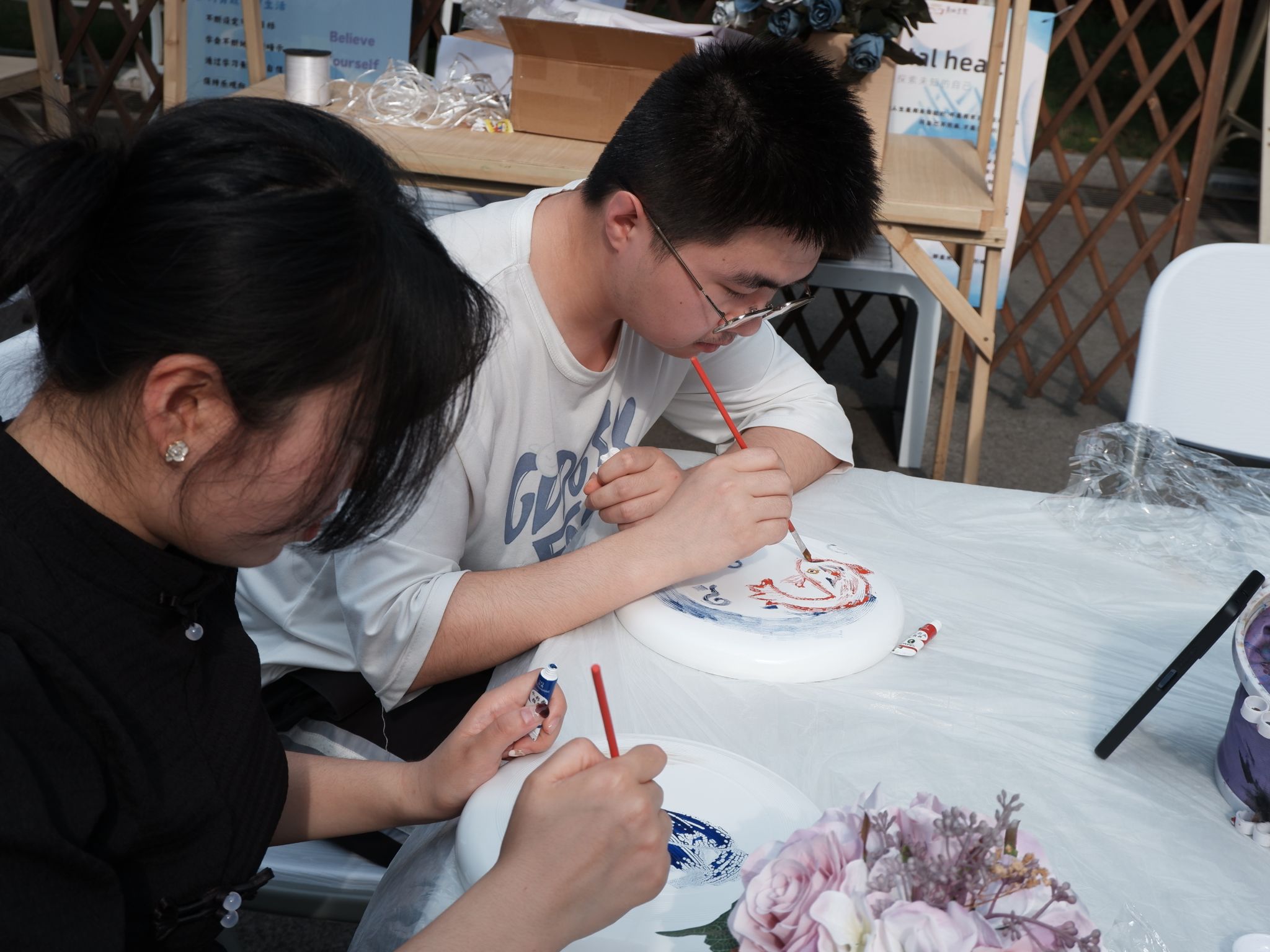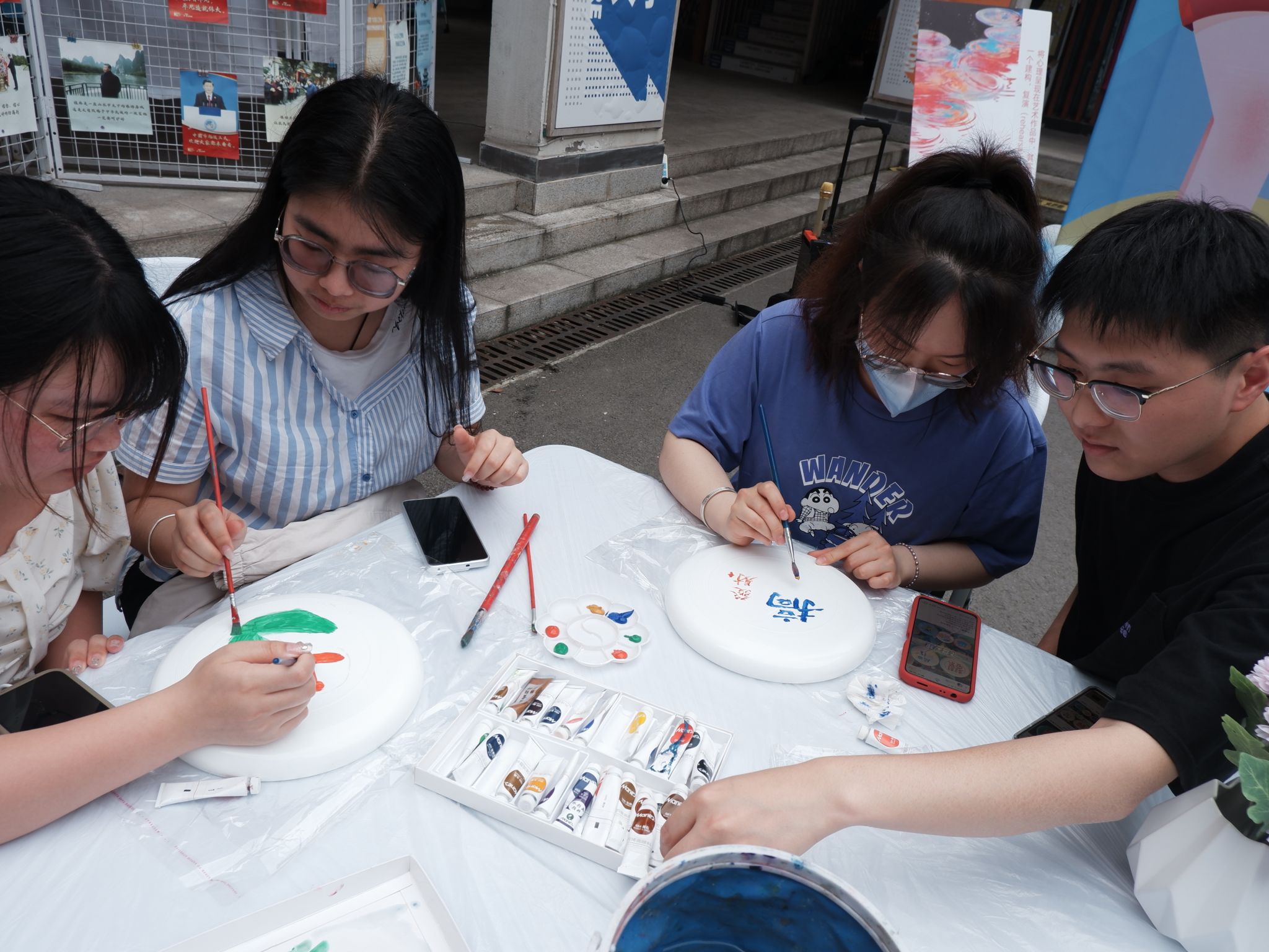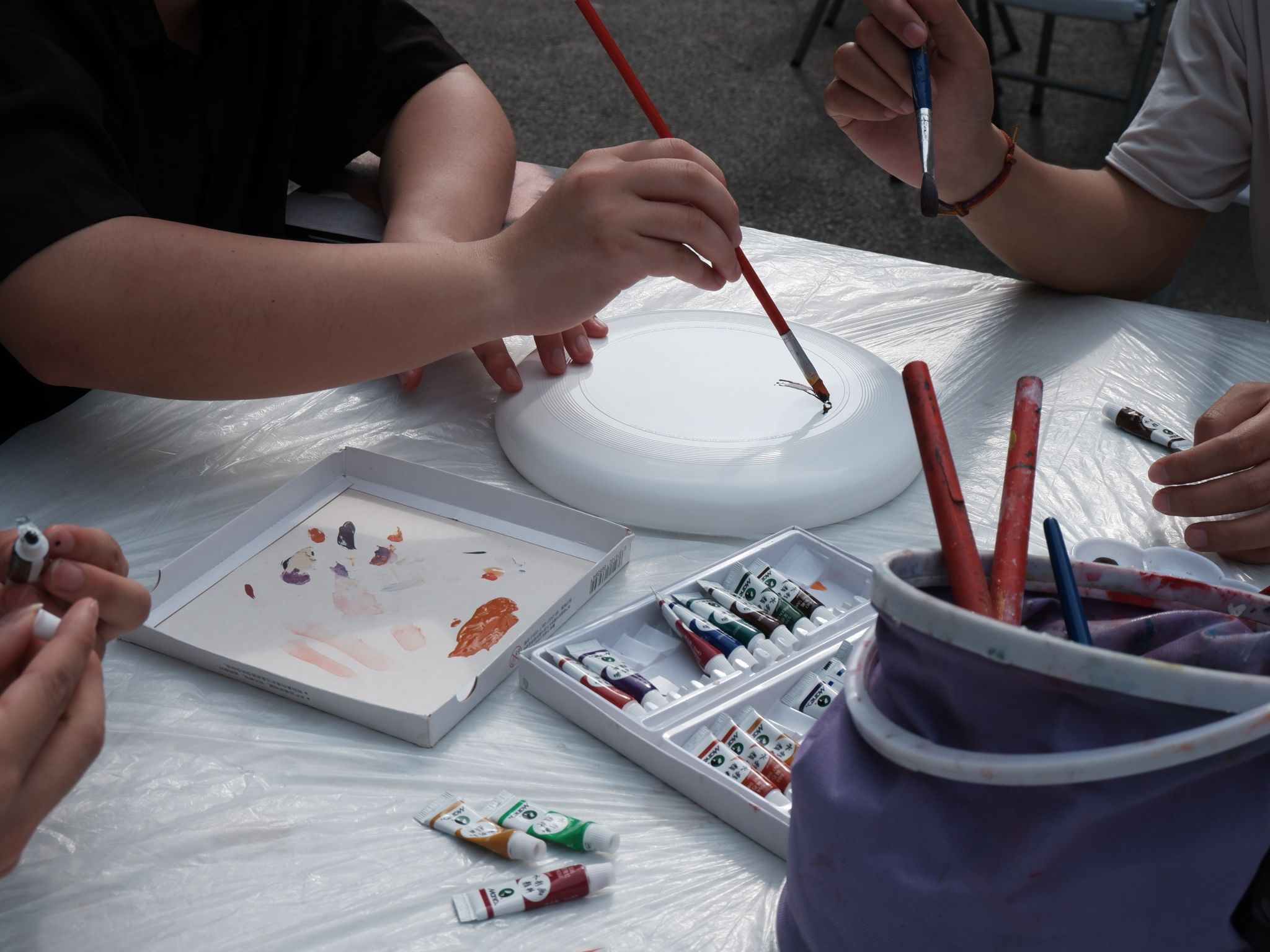 破冰结束后,同学们正式进入小组团辅互动,通过飞盘DIY涂鸦感受绘画的疗愈功能。绘画疗愈作为心理健康疏导的方法之一,能通过绘画工具,将作者潜意识内压抑的感情呈现出来,同时,在绘画的过程中,绘画者在心灵、情感、思想上都能将获得负能量的释放出来,调整情绪和心态,填补内心世界的空白,获得满足感。