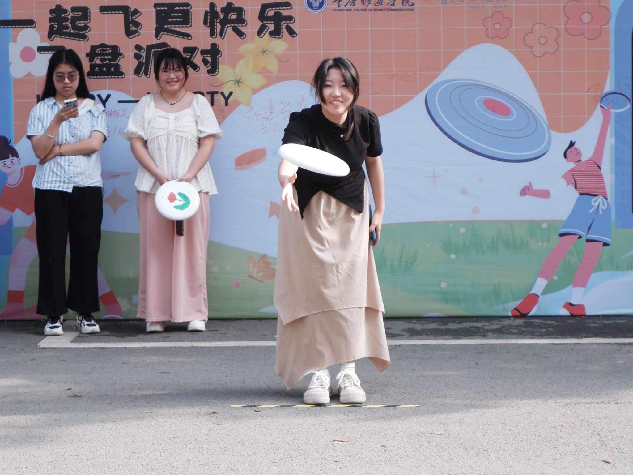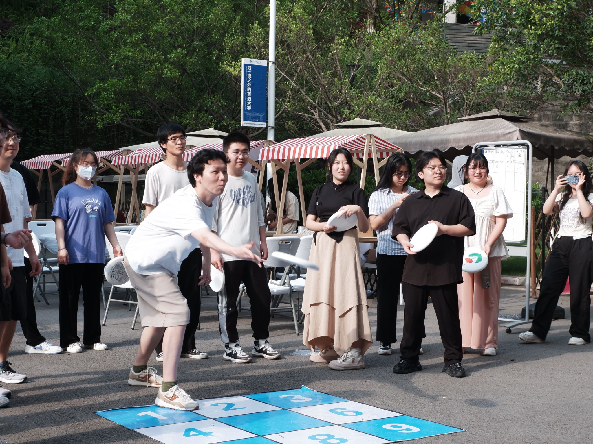 随后,同学们按照分组,分别进行飞盘九宫格、飞盘接力、飞盘掷远等团队互动,每组队员都投入在一次次的瞄准、抛出、接盘中,赛况渐入佳境,各组队员们在欢声笑语中放松身心,时刻感受着逐渐娴熟的技巧与协作,心中的压力和焦虑也伴着手上的飞盘一并抛出。同学们在飞盘运动的独特魅力和竞技价值中,酣畅淋漓地展示青春应有的活力,进一步体会朋辈友谊。