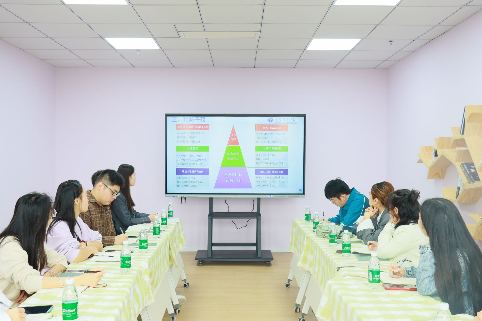 交流会随后在心理中心举行。会议由王雪燕老师拉开序幕,她全面介绍了綦江校区心理健康工作体系的六大支柱:完满人格教育实践、心理咨询服务、教育教学、实践活动、预防干预及队伍建设。王老师的详尽阐述如同一幅生动的画卷,让与会者清晰洞察了綦江校区心理工作的独特魅力与高效机制。随后,两校区教师围绕提升心理实践活动影响力、塑造品牌心理活动、深化完满人格实践等议题,展开了热烈而富有成效的讨论。此番交流不仅增进了双方对彼此心理工作的理解,更有助于提升心理健康工作能力,更好的为双校区学生服务。