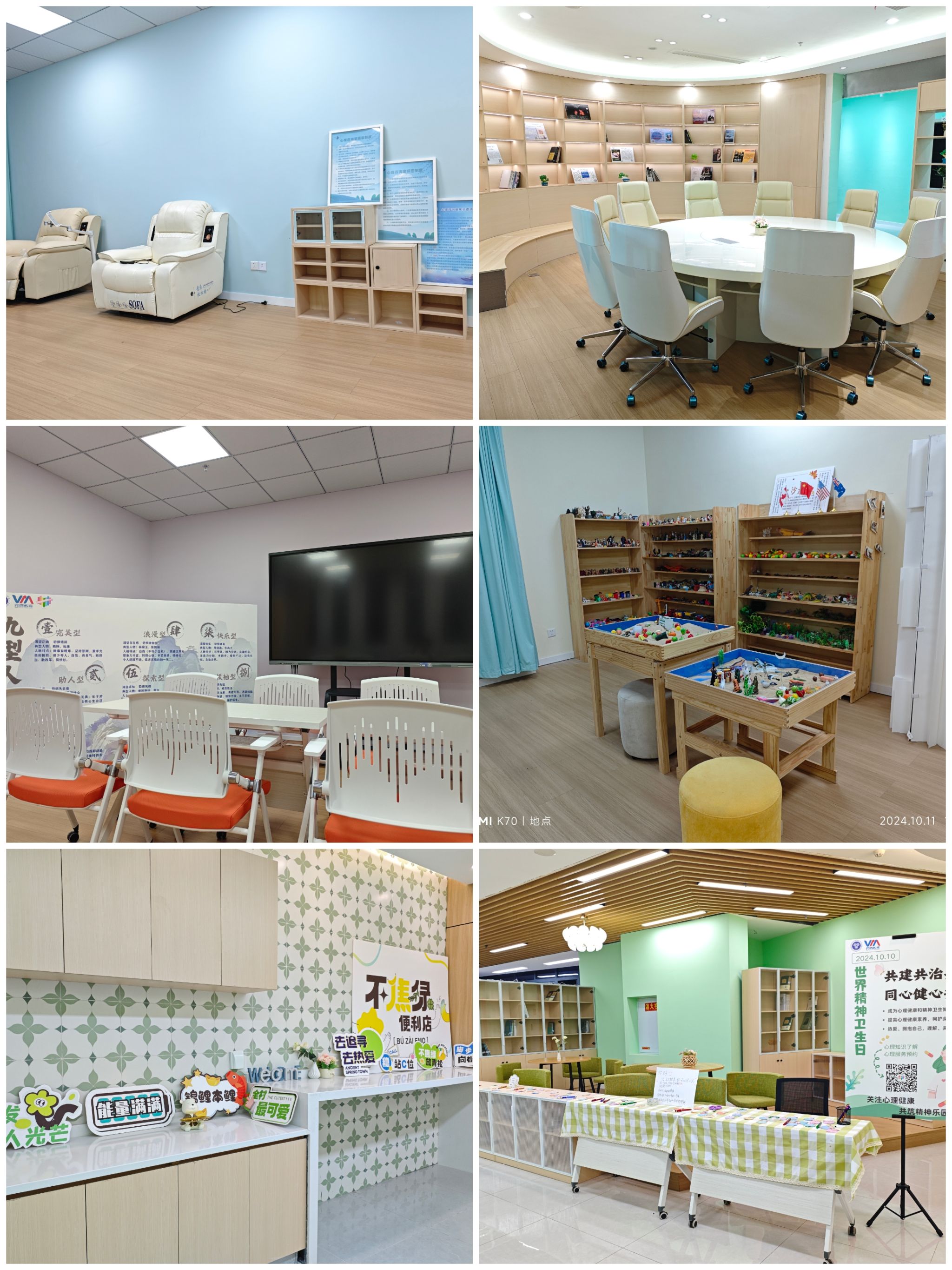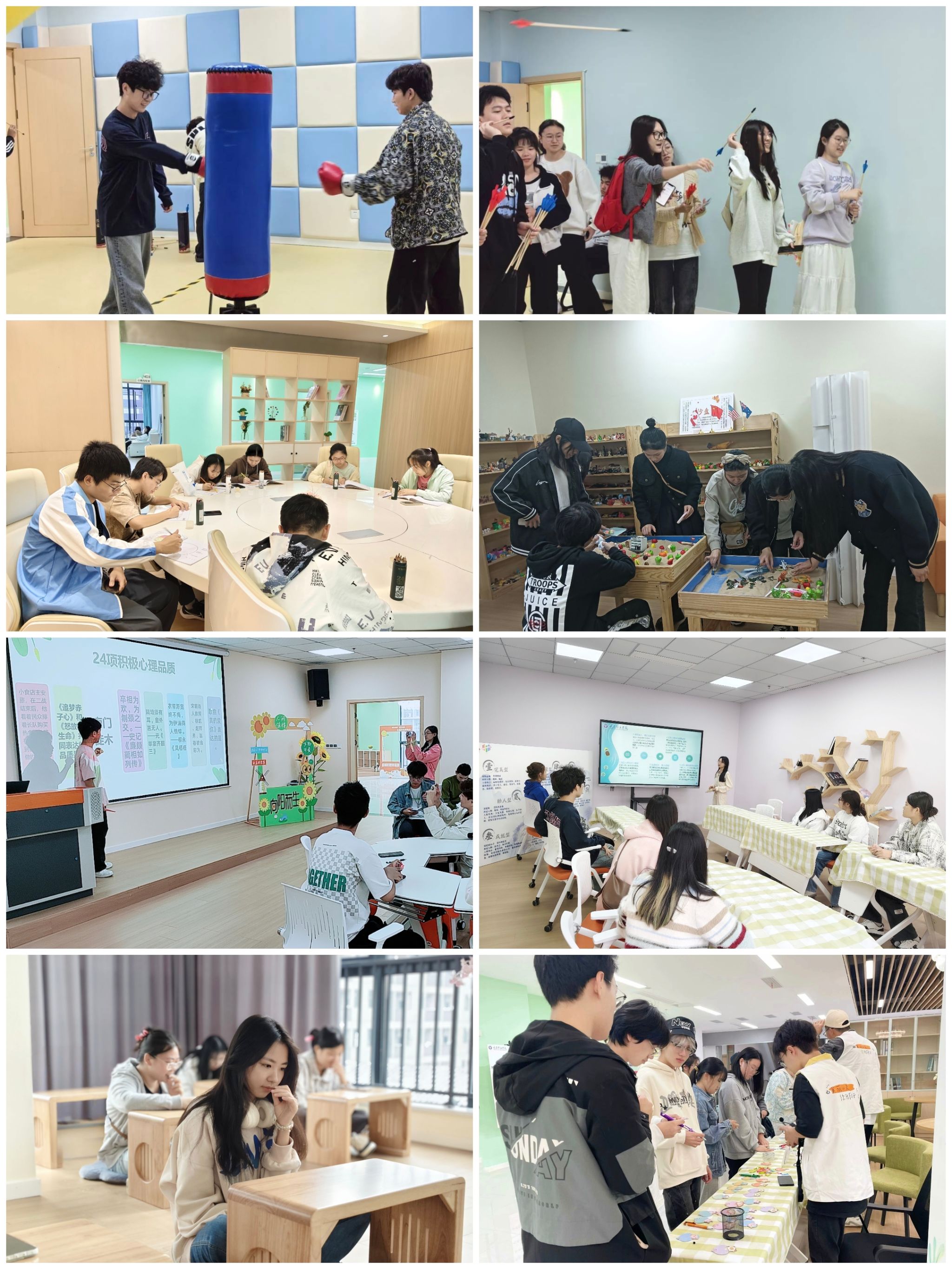 心理中心的各个功能室面向所有来访的师生开放,师生按线路游览,感受身心放松区动静结合、运动阅览相辅相成的开放空间。进入中心后师生了解预约流程、咨询室的咨询注意事项,合理认识心理咨询。走进宣泄室,借助多种宣泄设备开展活动,在安全私密的环境中排解负面情绪。途径朋辈互助区,沉浸体验曼陀罗情绪绘画;来到督导室,了解完满九型人格解析,学习专业的心理知识。