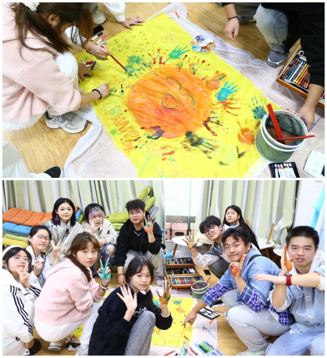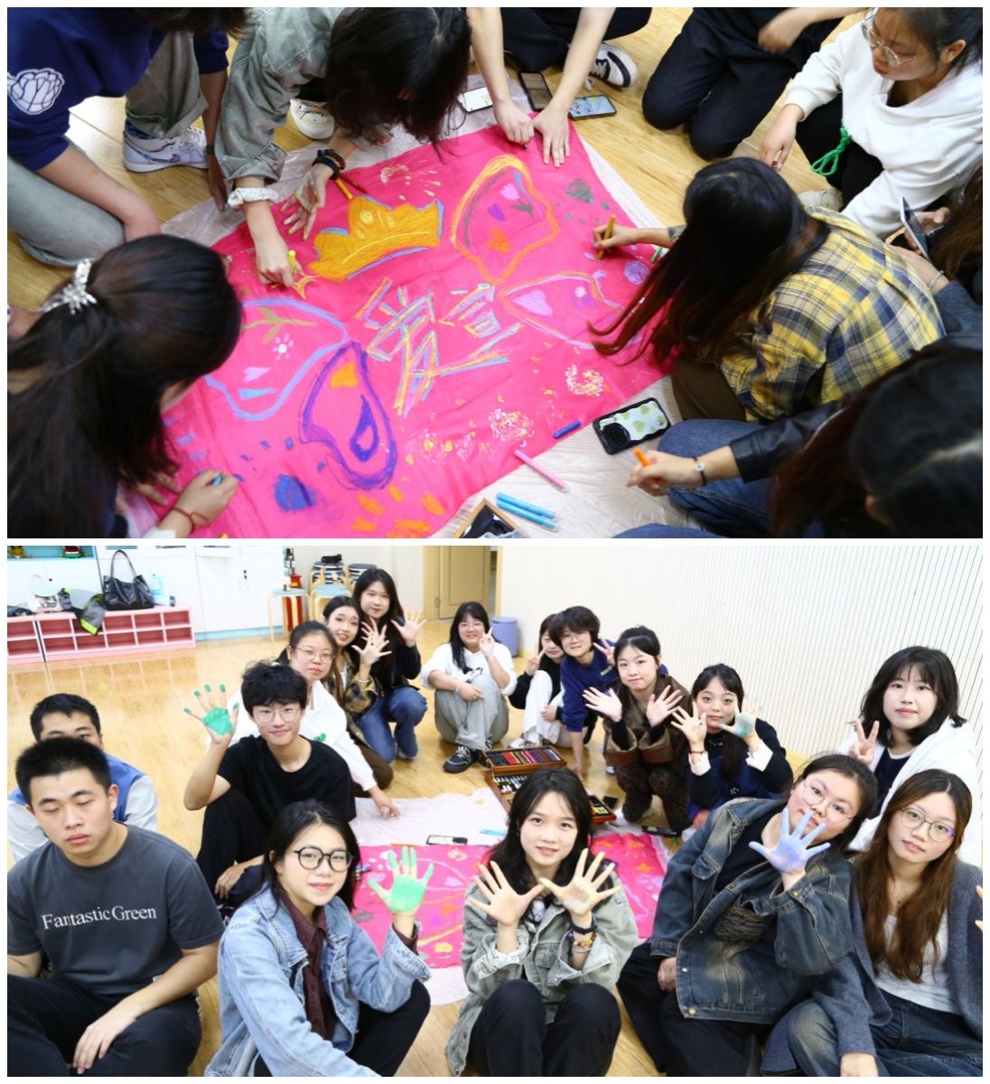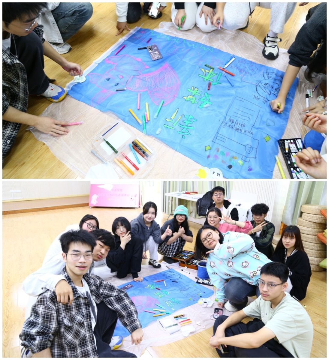 暖身活动后,成员们按照部门分成了三个组,分别是阳光成长部、爱心宣传部和新媒体咨询部。通过“绘画部门旗”与“团队展示”环节,进行团队文化建设。在“绘画部门旗环节”,每位成员都将自己的美好愿景和对部门未来生活的憧憬,用画笔在旗帜上描绘出来。
