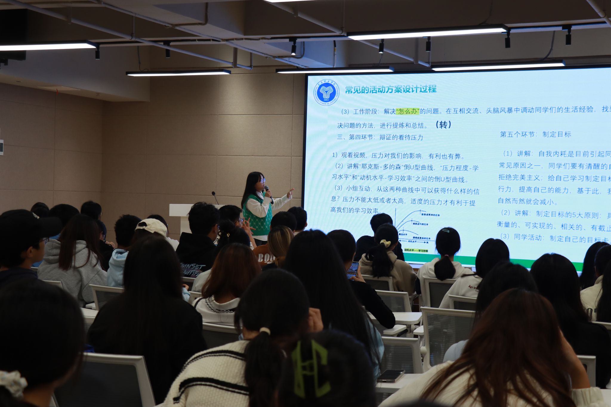 为了让同学们更加深入的了解常见活动方案设计过程中的 “起承转合”,侯老师对其展开了详尽阐释。“起”是暖身阶段,需营造宽松氛围,巧妙导入主题,使同学们自然融入。“承” 聚焦于 “为什么”,引导同学们深入思考,让大家理解主题内涵。“转” 围绕 “怎么办”,强调交流分享与头脑风暴,助力实践探索。“合” 是总结升华阶段,全面回顾,升华内容,实现知行合一。最后,侯老师以压力释放为主题的心理班会进行示范:以充满趣味的热身游戏开场,到相关理论知识的输出,再为同学们提供相应方法论,最后帮助同学们明确努力方向,环环相扣,所得颇多。