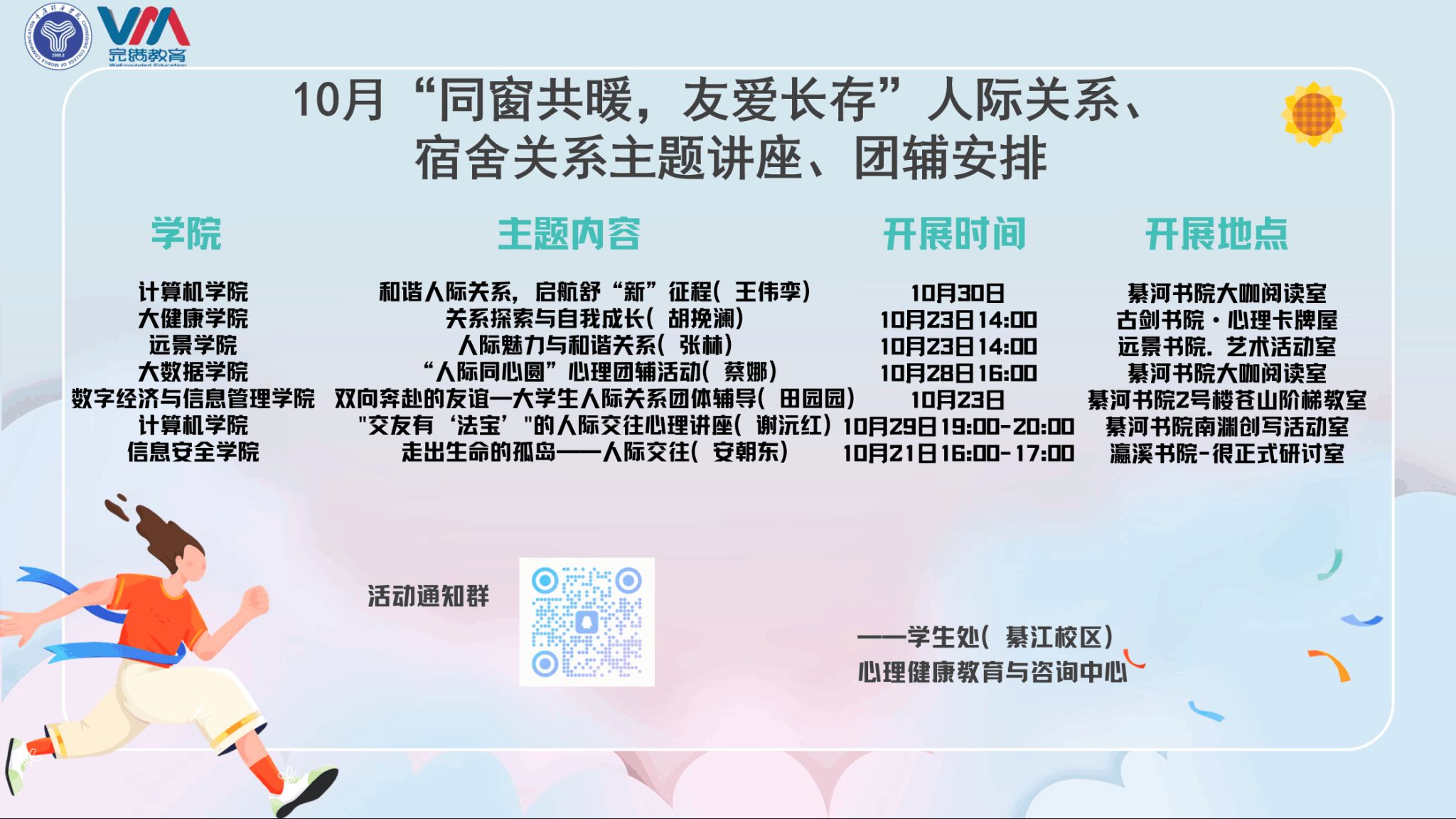 此次“同窗共暖,友爱长存”10 月主题系列讲座与团辅活动圆满落下帷幕,通过这一系列丰富多彩、形式多样的心理健康活动,不仅仅给同学们带来了实用的人际交往技巧、缓解压力的方法和积极面对挑战的心态,更契合了学校的完满教育理念。还为校园注入了温暖与包容的氛围,促进了和谐友爱的人际关系建设,为大学生活增添了亮丽色彩,推动学校完满教育的深入发展,助力培养全面发展的高素质人才。学生处心理健康教育与咨询中心将持续为师生开展心理健康教育活动,进一步巩固师生关系,为学生人格的发展助力,推动学校心理健康教育稳步迈进。