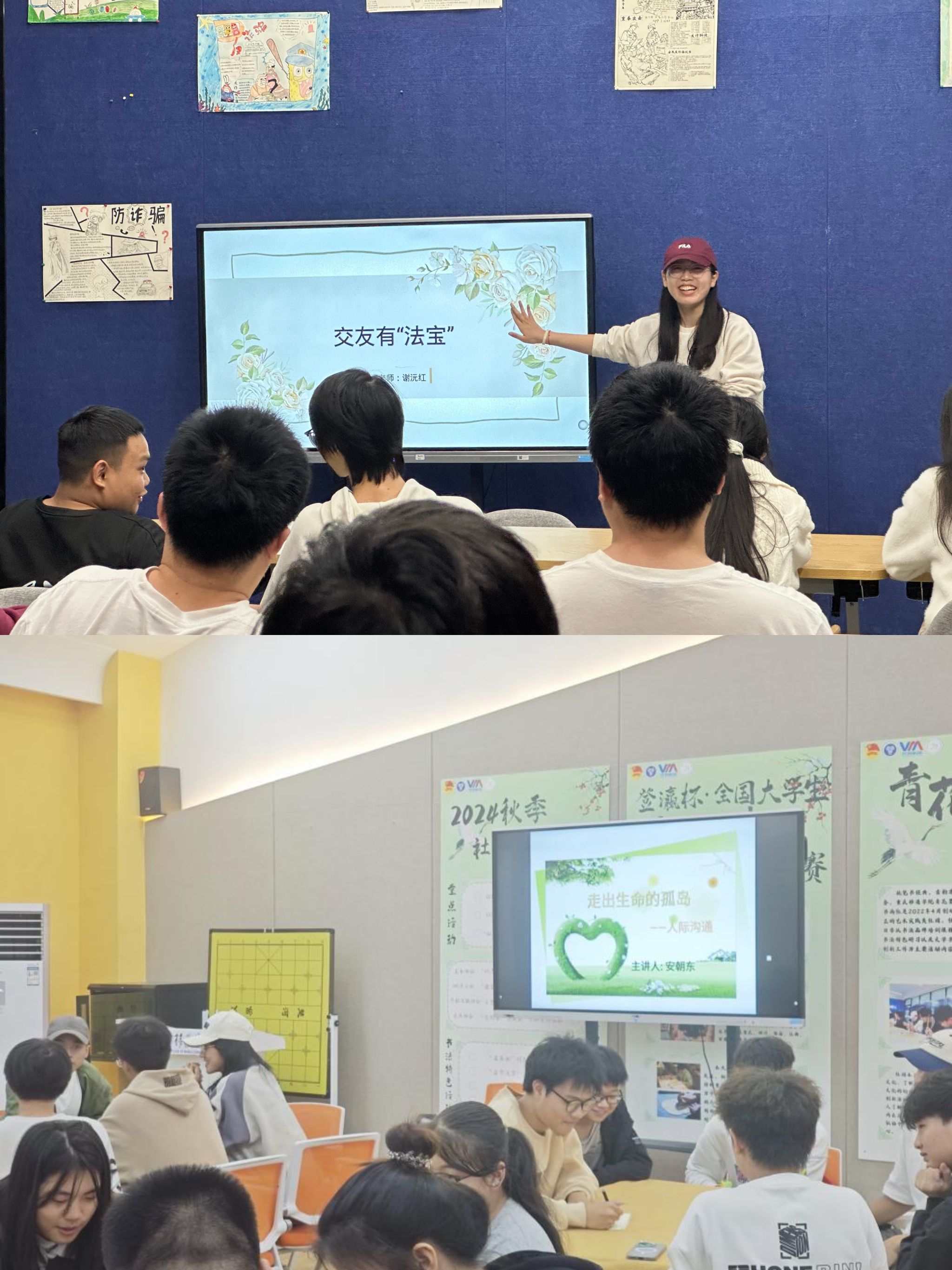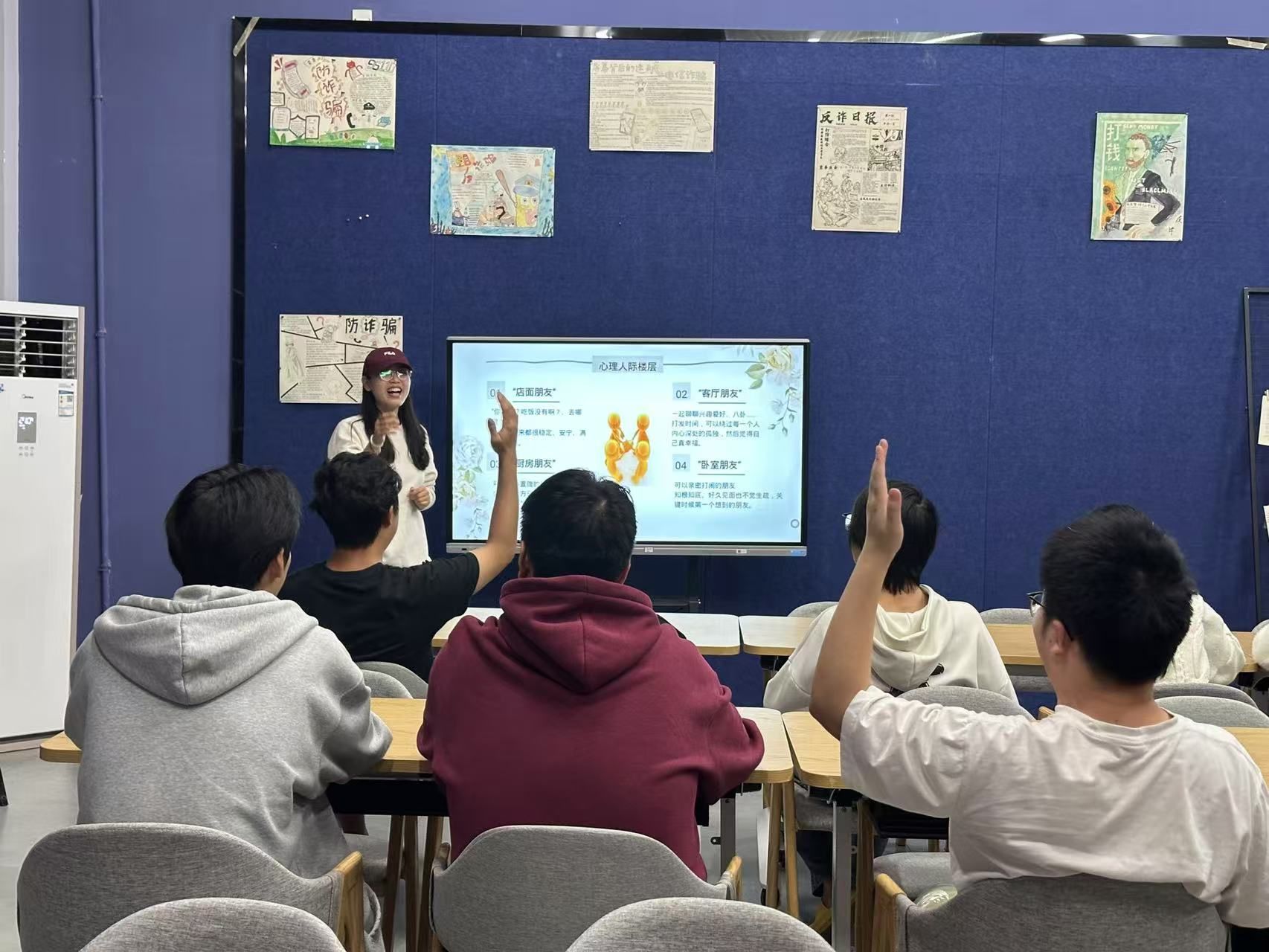 兼职心理教师胡老师组织“大学生人际关系探秘与自我成长”主题辅导活动。通过案例分析、 引用社会热点、穿插角色扮演和情景模拟等方式,分享人际交往与个人成长经验,讲解沟通技巧、自我认知重要性及专业术语,还提供了一对一的咨询服务。兼职心理教师谢沅红老师举办 “交友有‘法宝’” 人际交往心理讲座。以新颖形式,将人际关系比作大楼讲解,还有写出自己的爱好、小组之间互相交流、写出优点卡片、写不足及反馈等环节。同学们积极参与,在各环节中领悟交友之道,不再迷茫,挖掘自身亮点,打开心扉,感受赞美,审视不足。兼职心理教师王伟孪通过生动的案例和互动问答,向新生传授建立与维护人际关系的技巧以及处理人际冲突的方法。在随后的 “心灵对话” 环节,新生们闭眼深思在学校遇到的不适,相互分享期待与担忧,在交流中释放压力,并获得大家的共鸣。兼职心理教师蔡娜通过介绍人际交往的重要性,以“同学分享”这一环节,讲述了克服害羞与陌生人交流的故事。引入“你比划我猜”报数分组”“相识面对面”等游戏。通过这些精心设计的游戏和互动,帮助学生提升沟通技巧,加深相互了解,建立更加和谐的人际关系。
