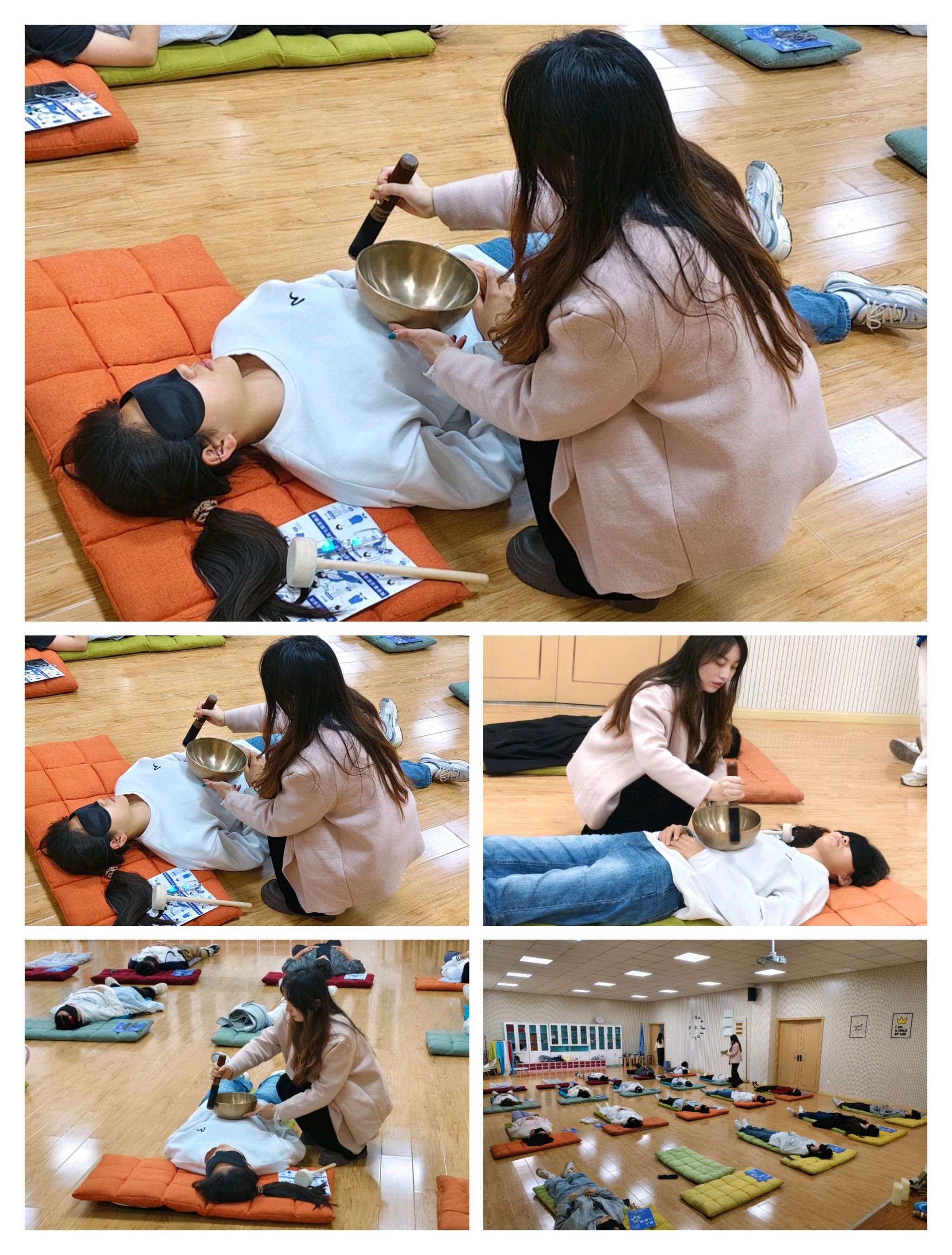 团辅室内,参与者们静躺在棉垫,跟随深沉柔和的颂钵声响,进入了深度放松状态。颂钵的振动不仅在身体层面疏通淤堵、促进血气循环,还在能量层面唤醒、净化、平衡七个脉轮的能量,提高免疫力。精神层面上,颂钵的声音越过理性思维,带来深层的放松效果。参与者们在活动后纷纷表示,颂钵治疗让他们体验到了前所未有的放松和愉悦。一位参与者分享说:“这次的颂钵疗愈,对我来说,是一次全身心的放松。我已经很久没有体验到这种感受了,真的很神奇。”颂钵治疗不仅改善了参与者的睡眠质量,还舒缓了心身压力,协调了情绪,缓解了疼痛感受。