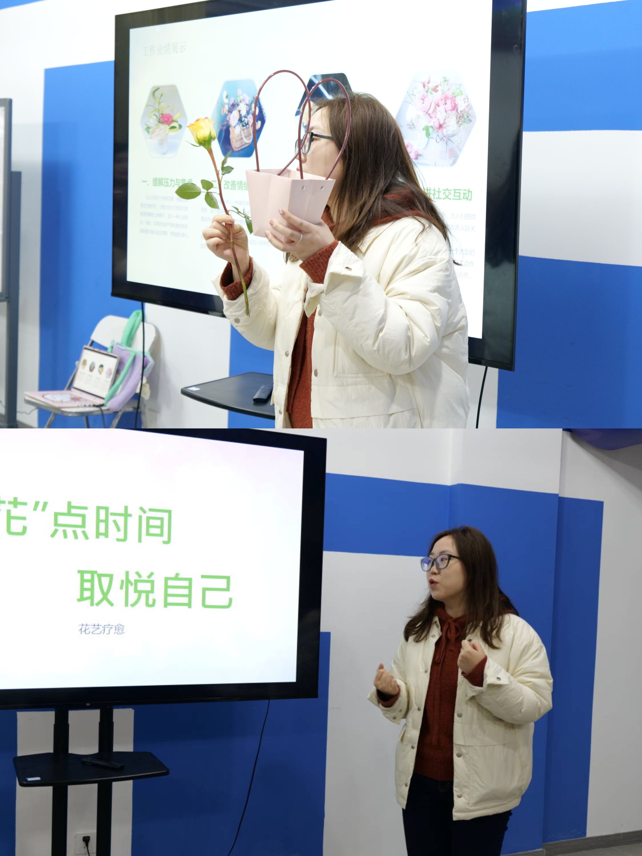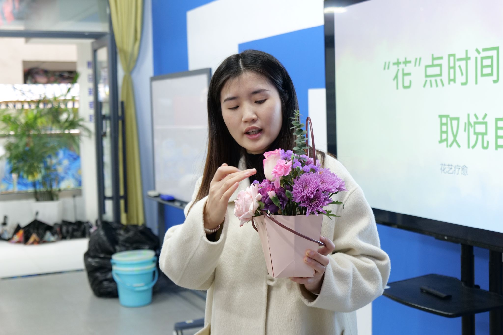 心理健康中心兼职老师梁倩围绕插花艺术及花艺疗愈相关知识点为大家讲解了插花不仅是可以提高审美情趣,也同时可以让我们在体验的过程中找寻自我。花艺疗愈在心理学认知疗法中运用较为普遍,可以在缓解压力与焦虑,改善情绪状态,增强自我认知,促进社交互动,辅助心理治疗等方面起到较好效果。当人专注于修剪花枝、搭配色彩等花艺操作时,注意力会从引发压力和焦虑的事物上转移开,进入一种心流状态。同时,花草的自然气息和柔和色彩能刺激大脑分泌血清素,帮助放松身心。开始插花之前,梁倩老师还讲解了插花的基本步骤,强调插花应注重色彩与形态的和谐搭配,并根据空间与环境调整作品风格。
