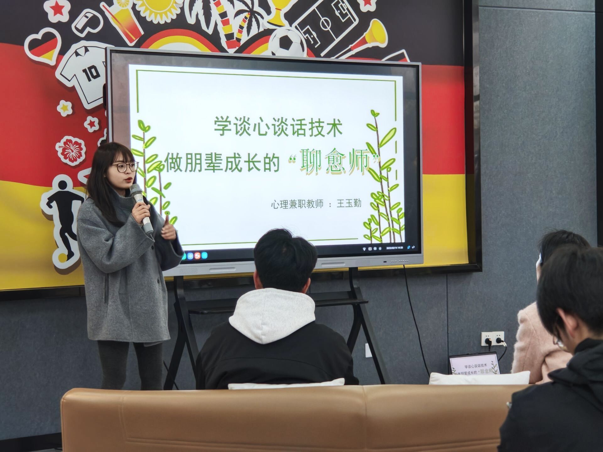 为进一步提升我院心理委员的朋辈互助能力,充分发挥心理委员“聊愈师”的作用,提升心理疏导能力,更好地服务同学们心理健康成长。淬炼商学院微光育心辅导员工作室于3月14日下午3点在南湖书院中德意工坊开展学谈心谈话技术·做朋辈成长的“聊愈师”——淬炼商学院2025年第一期心理委员培训会。此次培训会有幸邀请到校兼职心理健康教育教师王玉勤老师主讲,淬炼商学院心理专项岗教师韩舒臣主持,2024级全体心理委员共同参与。