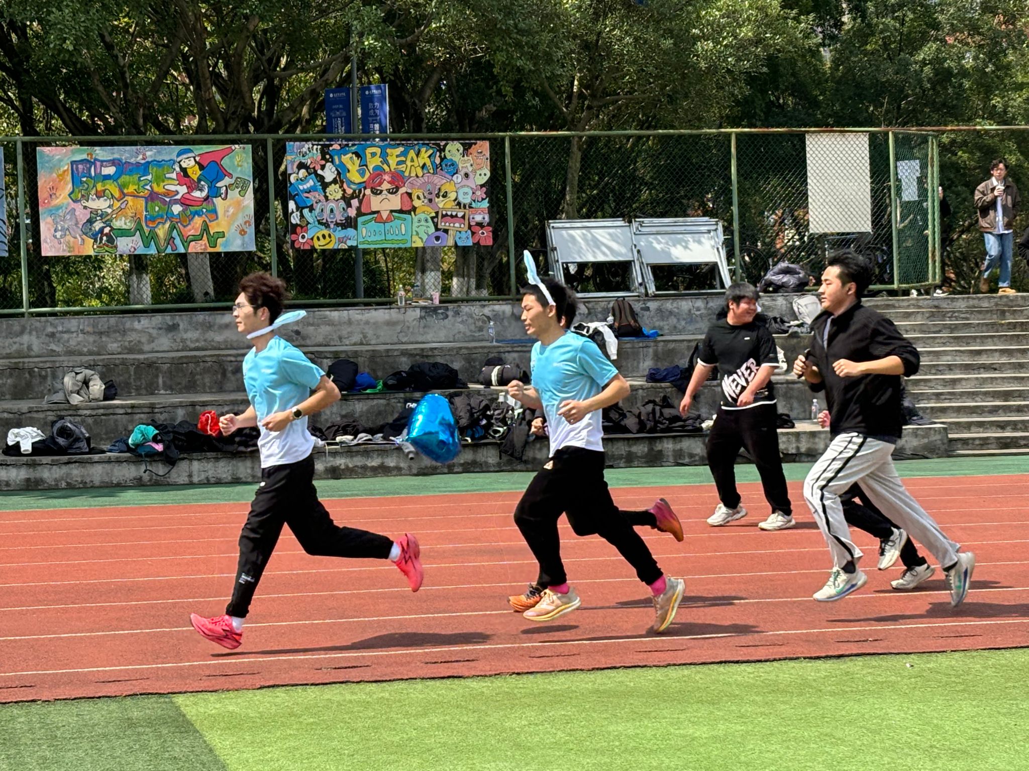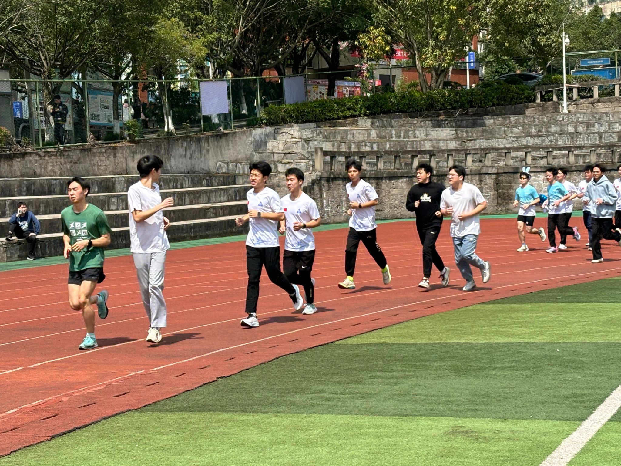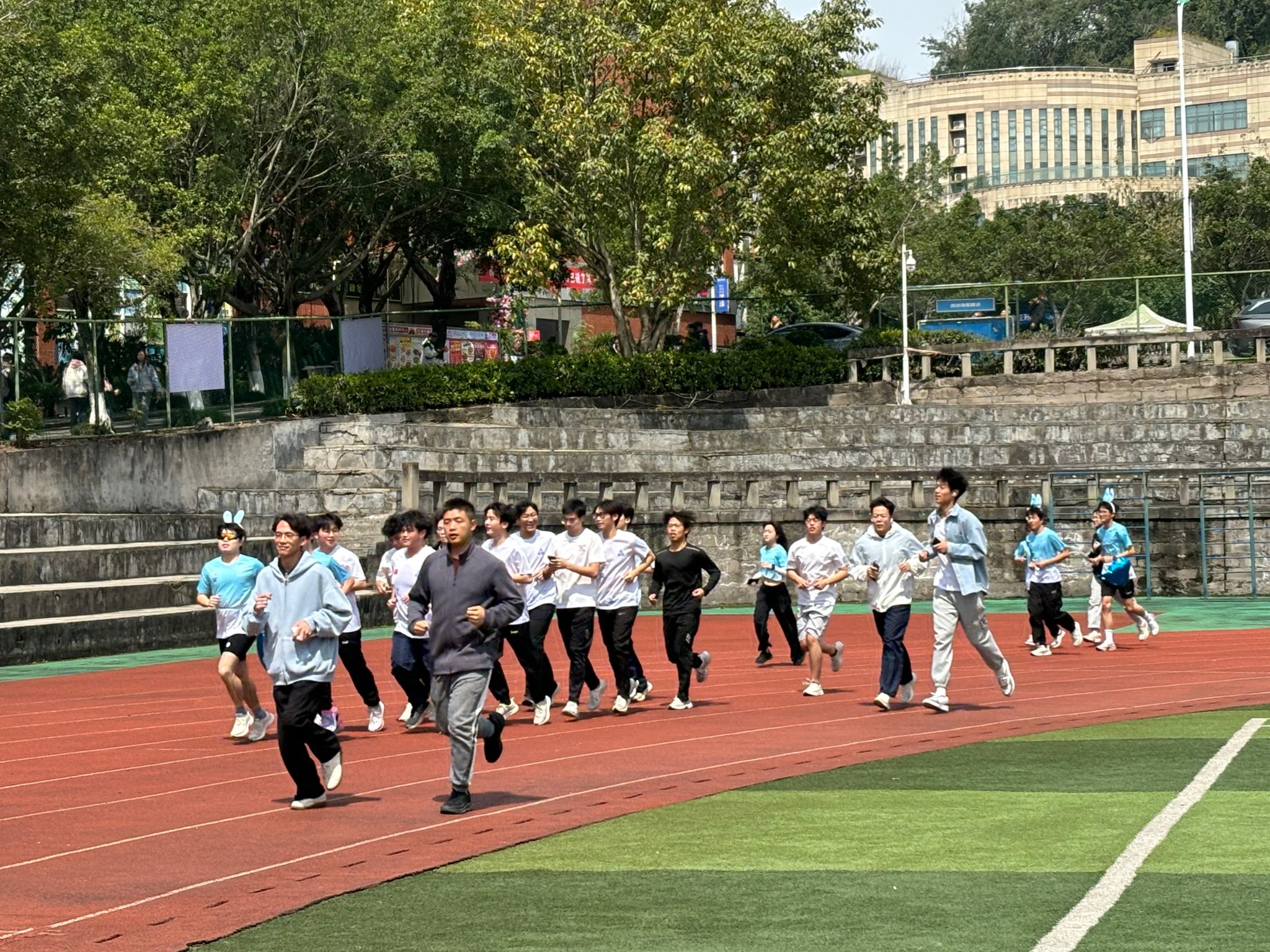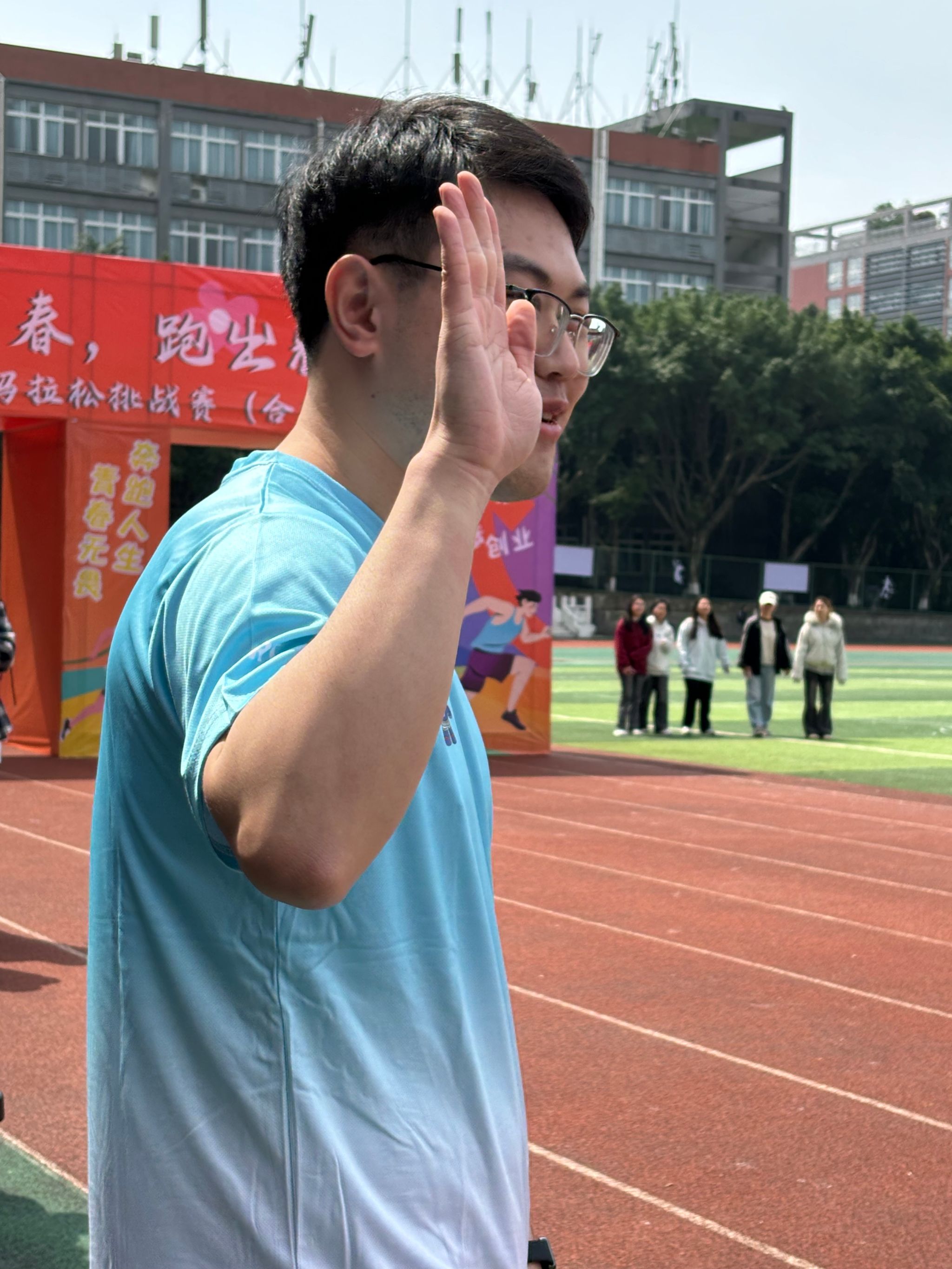 紧接着,同学们在跑道上挥洒汗水,迈着坚定的步伐,发丝随风扬起,汗珠随风落下。太阳洒下余光,散落在同学们挺直的后背上和发梢上。跑道上的同学们仍旧在奔跑,蓝天铺垫在同学们的身后,同学们的影子映在草坪上,洁白的院服,被汗水浸湿,是青春最美的模样。