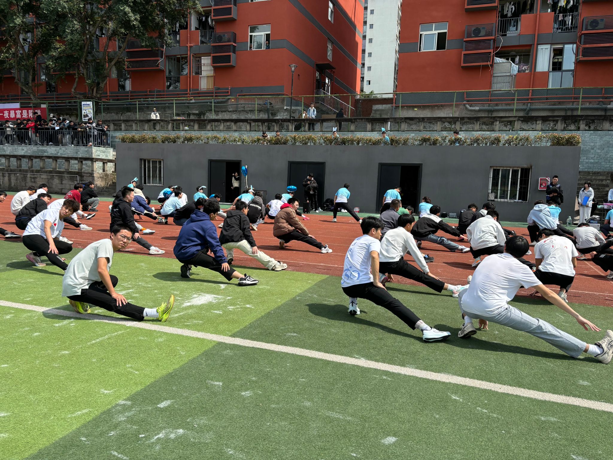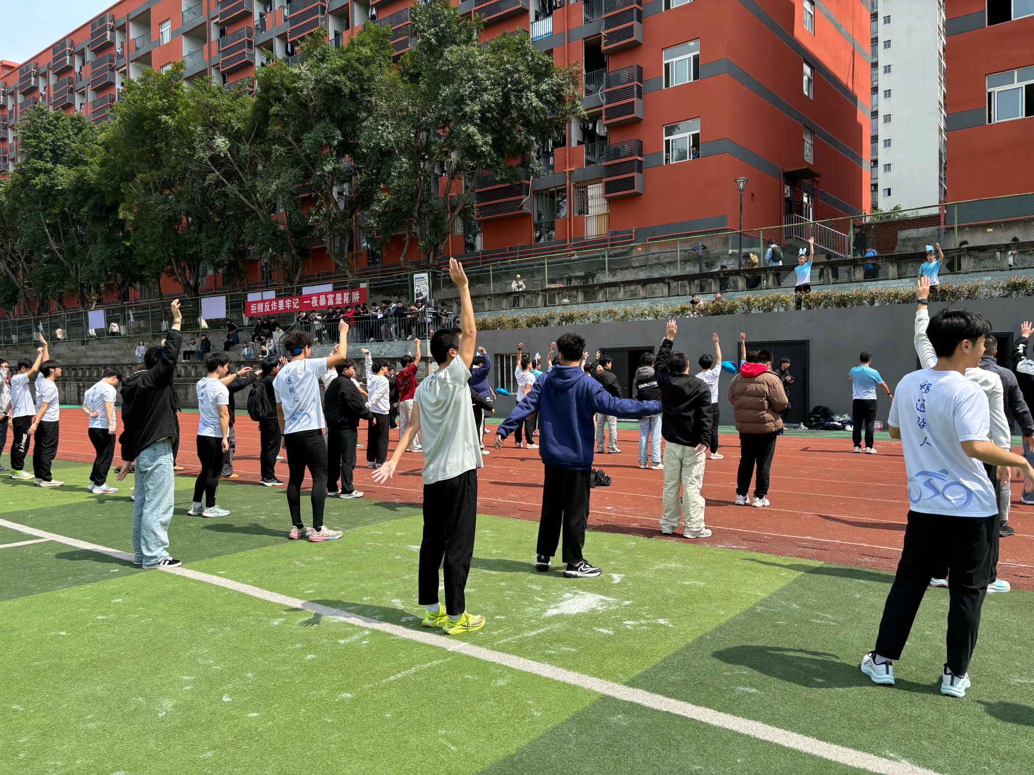 然后,在唐宇老师的带领下,同学们随着音乐的节奏,在足球场上开始了热身活动。配上欢快的旋律,有效地活动了同学们的上肢、肩、颈、脚等部位。
