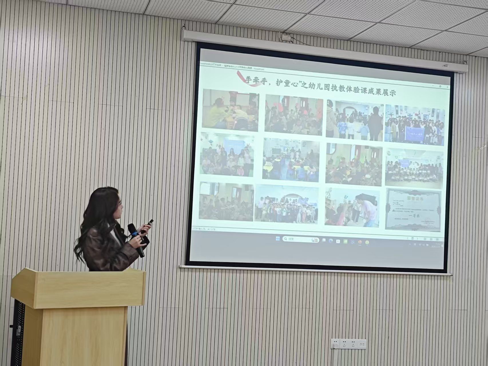 田雨老师上台发言,她向众人介绍了小学执教小组的成立意义是以志愿服务的方式让学生参与到低年龄的儿童守护中,以趣味课堂情景模拟,互动游戏等方式深入到幼儿园和小学当中开展志愿服务项目,从2017年初步的尝试到到现在,心理站已经经过了多年的培训和建设,现以获得了优异的成绩。田雨老师指出了小学生心理健康的重要性,并对兴趣小组提出期望:"希望通过兴趣活动,帮助孩子们建立积极心态,提升心理韧性。"随后主持人宣布了小学兴趣执教组人员名单,小学兴趣执教组全体成员上台,由工作人员发放工作牌并完成合影留念。