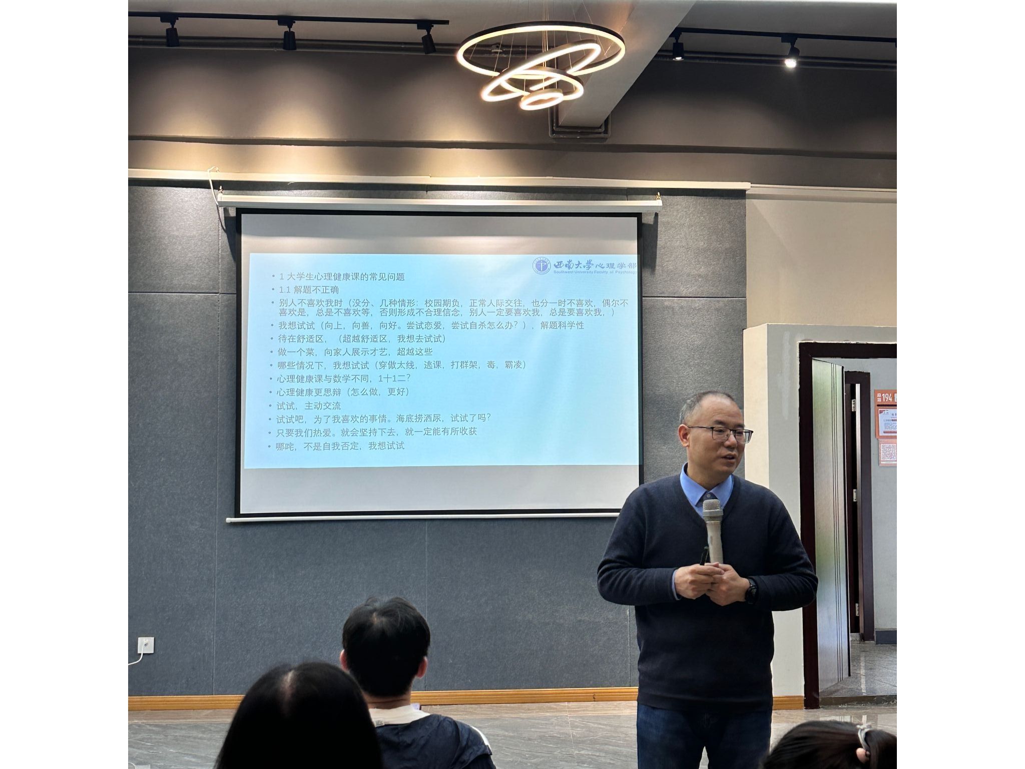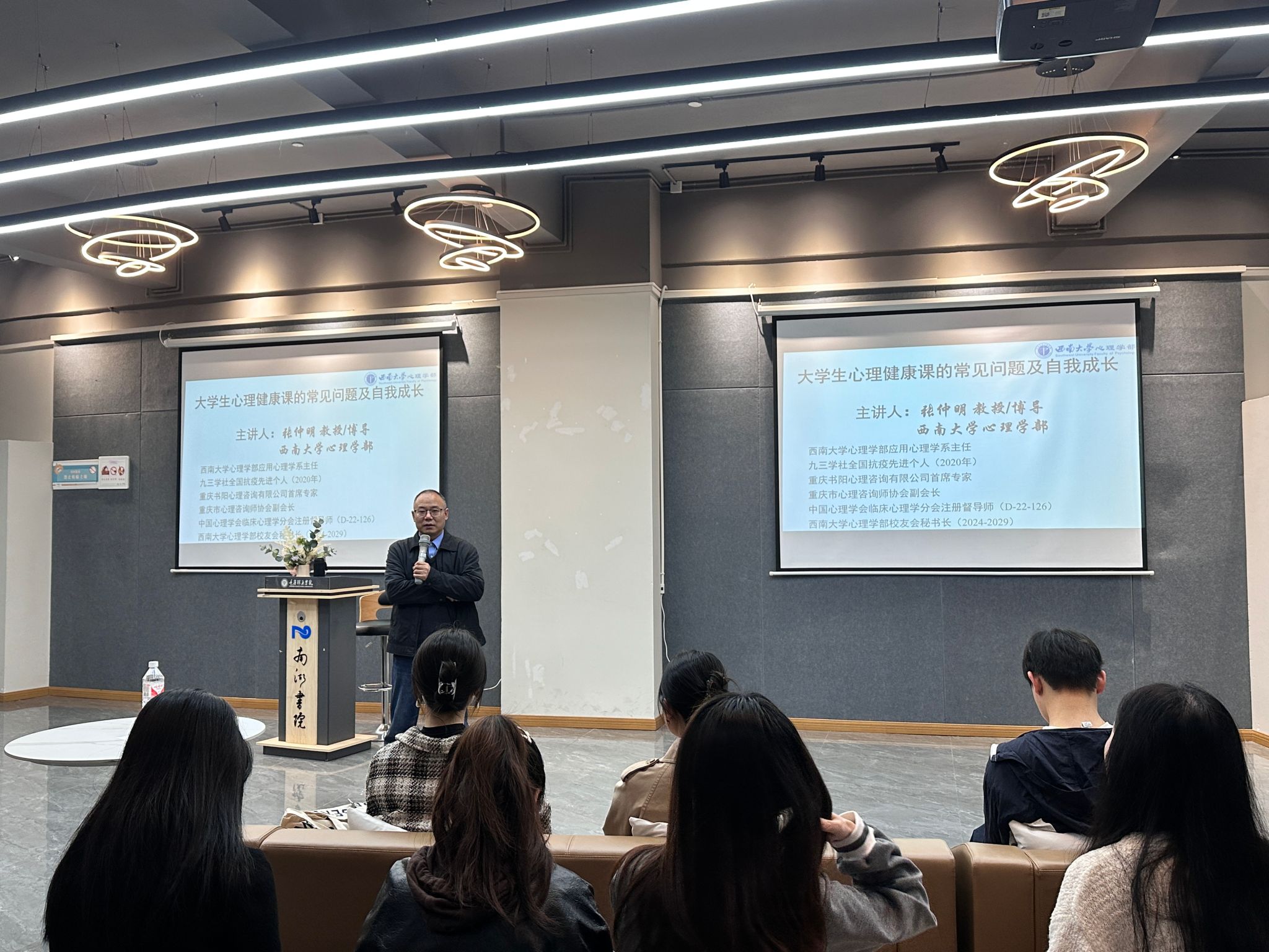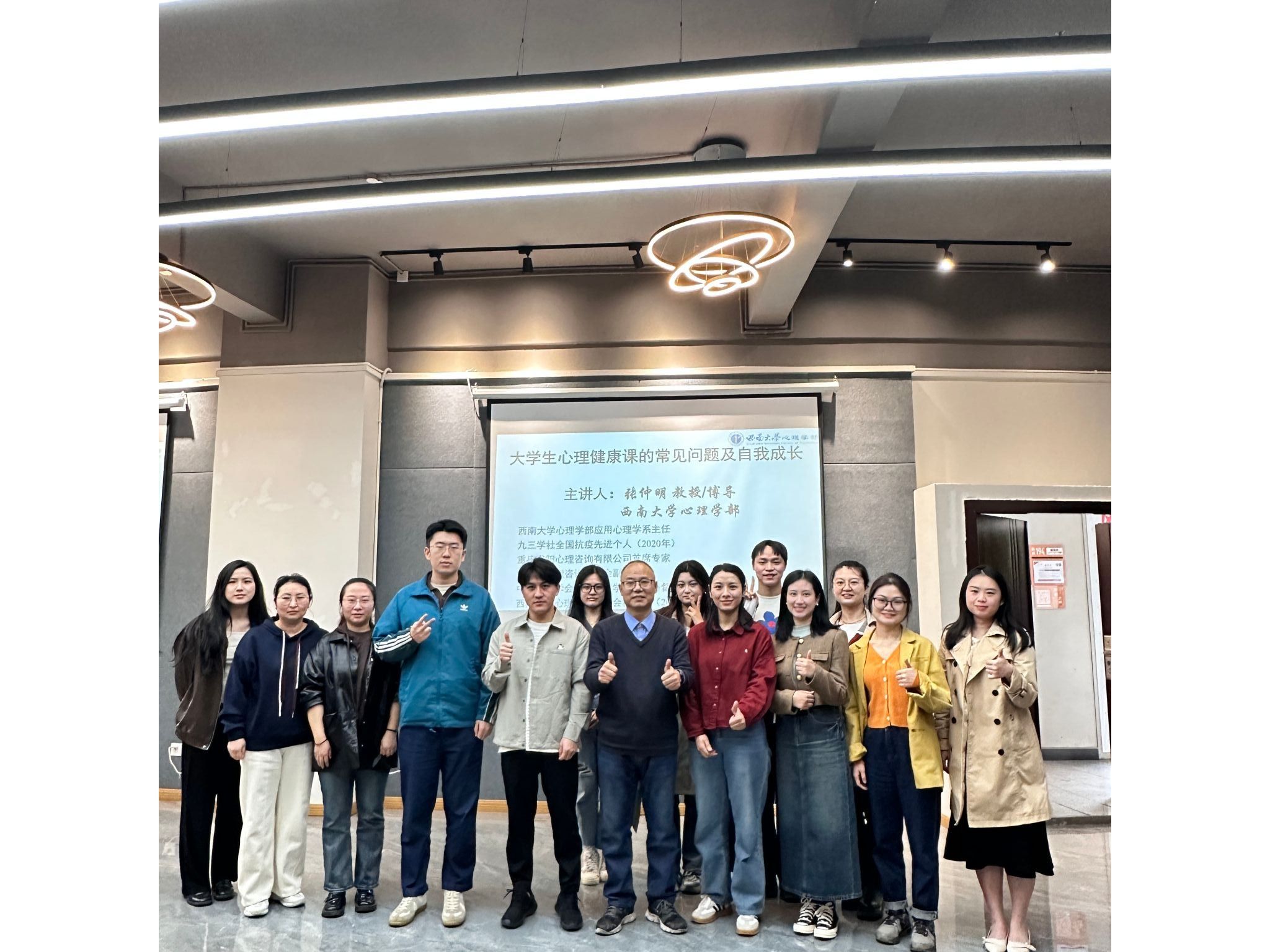 为深化高校心理健康教育教学改革,提升教师专业素养,2025年3月27日上午,由合川校区心理健康教育与服务中心主办的“2025年春期教学研讨会”在南湖书院顺利举行。西南大学心理学部应用心理系主任张仲明教授受邀担任主讲嘉宾,围绕“大学生心理健康课的常见问题及自我成长”主题,与心理健康课的教师们展开深度对话,现场反响热烈。