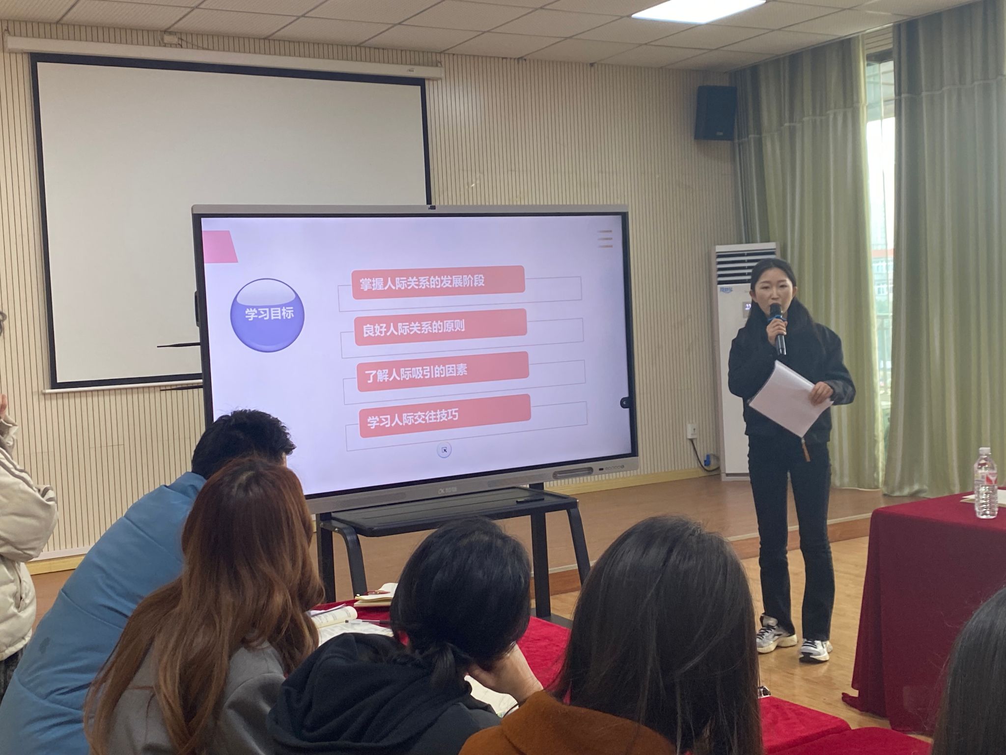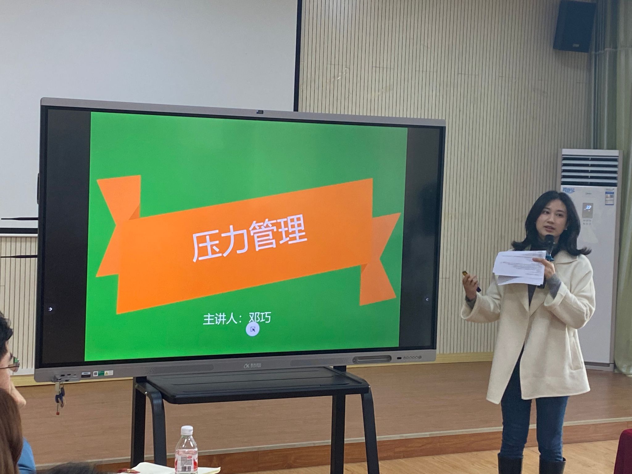在教育教学研讨环节,李然老师以人际关系专题为核心,深入剖析了自我暴露对深化人际信任的作用,并阐释了良好人际关系的四大原则,建议教师在课堂中鼓励学生分享个人经历,以增强互动性与课堂感染力。邓巧老师则围绕压力管理主题,系统讲解了情绪ABC理论、5秒呼吸法及红绿灯法等实用技巧,结合实例论证压力的积极作用,并向学生推荐网易云音乐、冥想类APP等辅助工具,帮助学生科学应对压力。