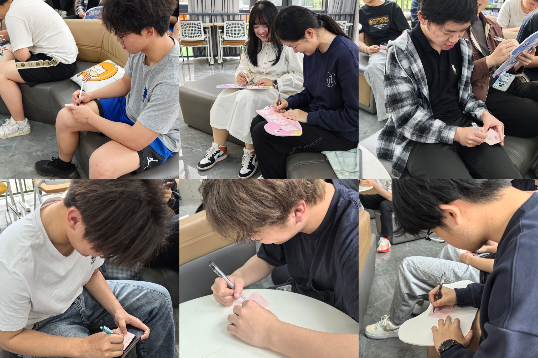游戏过后,活动进入分享环节。每位同学在纸上认真写下了自己在近期感受到压力的事件。随后大家将自己的“压力事件”放入压力箱打乱再抽取。同学们认真阅读他人的压力,并真诚的给出自己的建议。