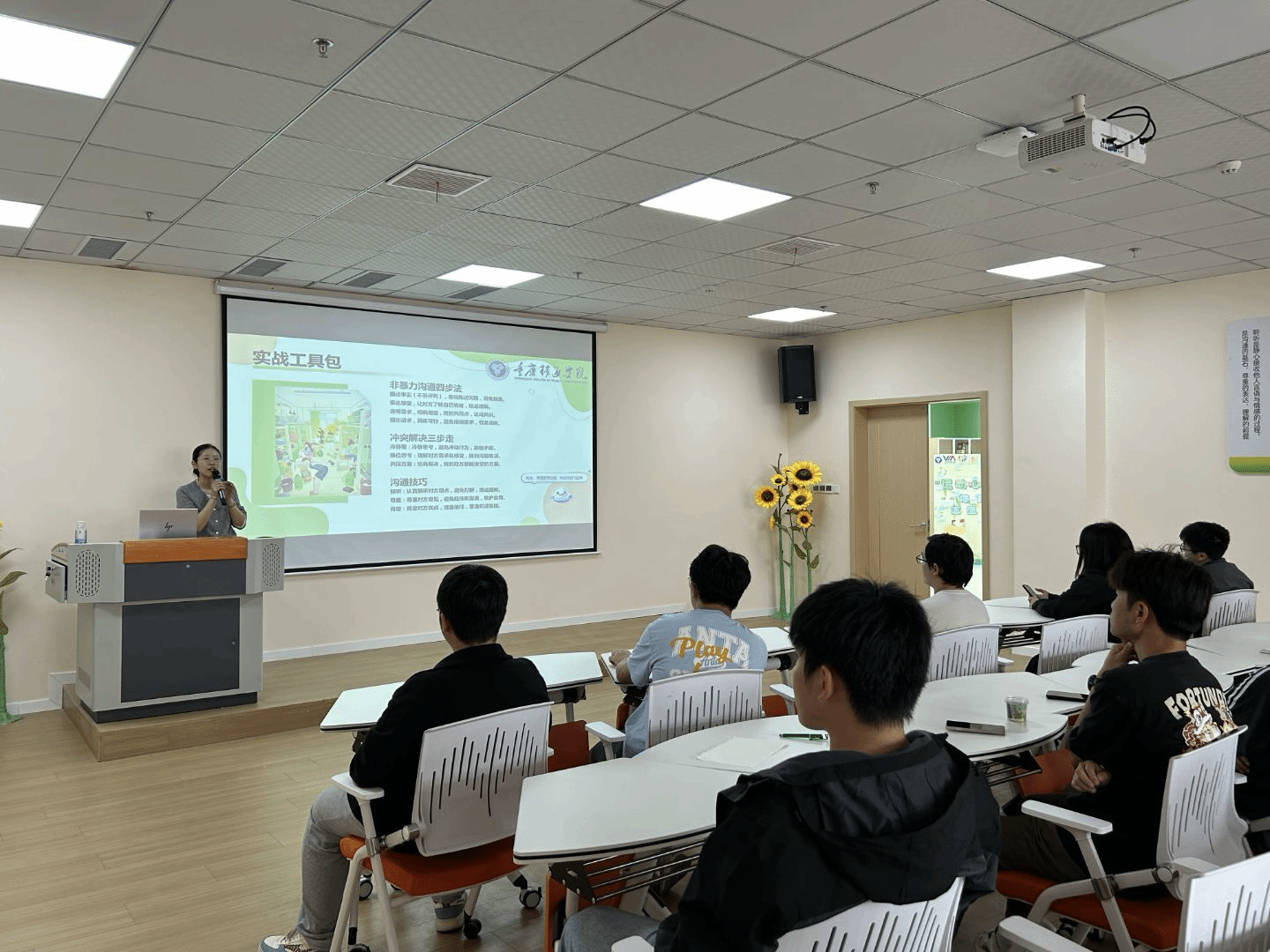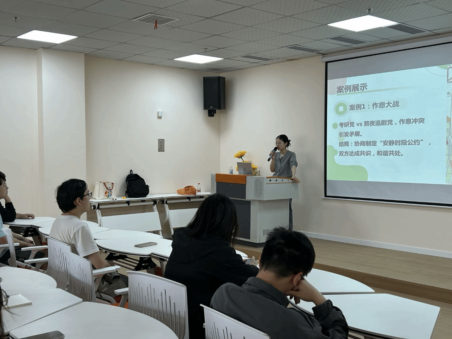 宿舍是重要的生活和学习场所,宿舍关系的好坏直接影响着学生的身心健康和学习生活质量。为了加强宿舍文化建设,提高宿舍成员之间的相互理解与沟通,营造和谐、温馨的宿舍氛围,学生处心理健康教育与咨询中心(后面简称心理中心)兼职教师谢沅红老师于4月23日下午15:00在心理中心开展了“大学生寝室生存指南的宿舍关系管理和矛盾化解”专题培训。