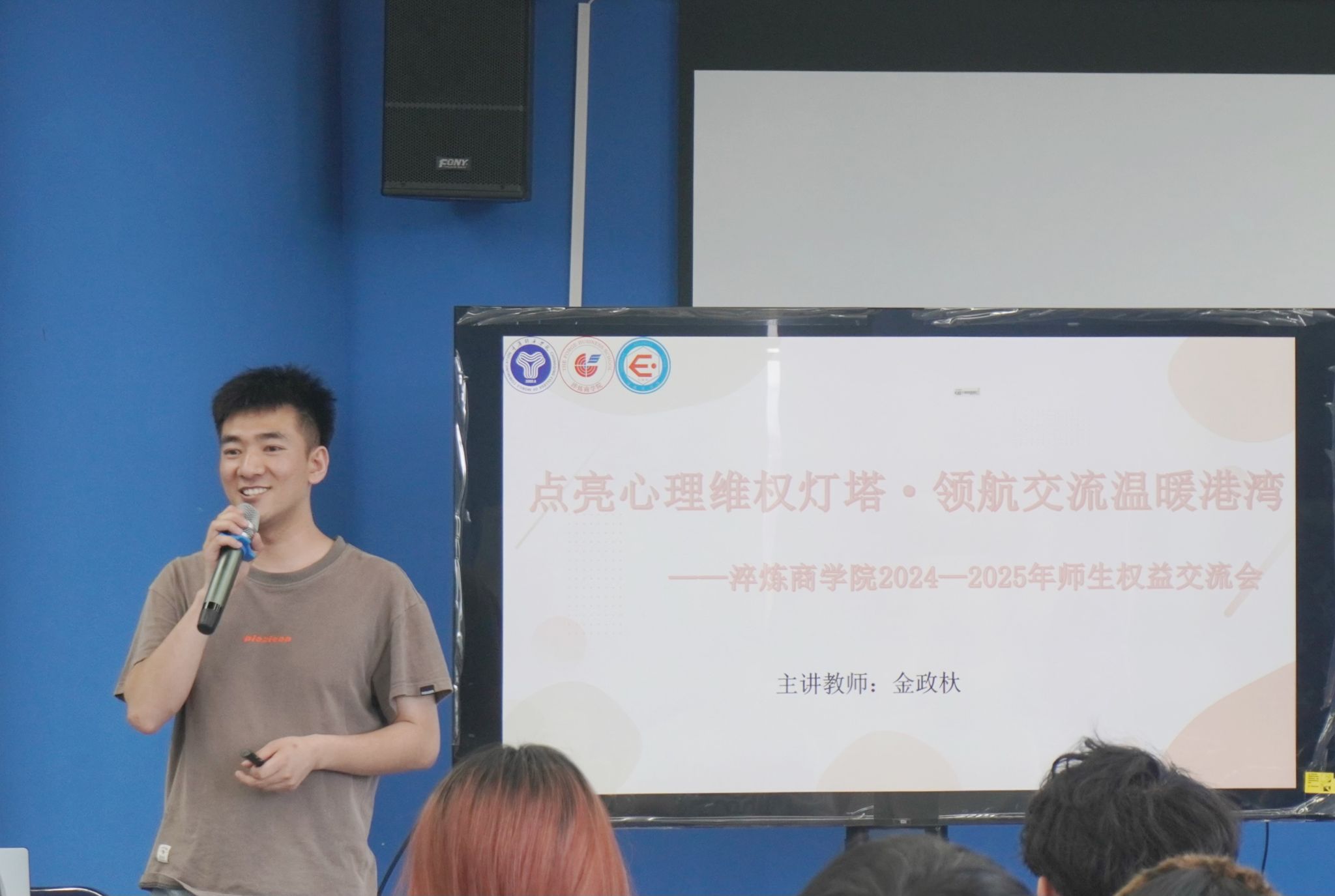 为了更好地关注学生们的心理健康,提升他们的权益保护意识,探讨心理健康与权益保护的重要性。淬炼商学院权益部特邀请学校心理健康教育与咨询中心兼职教师金政杕于2025年4月25日下午14:30在天空书院揽江厅·师生交流室开展“点亮心理维权灯塔·领航交流温暖港湾”为主题的讲座。通过搭建开放、包容的交流平台,让师生们能够畅所欲言,分享自己的经历与感受,共同探讨解决问题的方法。
