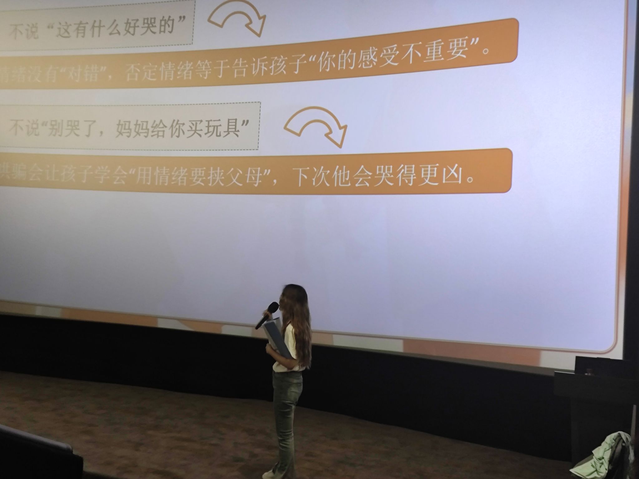“看见情绪”环节中,强调家长及时察觉孩子情绪异动并给予有效关注引导的重要性,这在很大程度上决定孩子心理危机的走向。随后,丁滢老师结合真实案例与心理学理论,以中央电视台教育纪录片——“你听见了吗”之情绪罐子展开讲解。详细剖析了青少年常见的心理障碍,并指出“孩子的情绪是求救信号”,呼吁家长不忽视、不否定、不压抑的“三不原则”,及时察觉异常,给予有效引导。