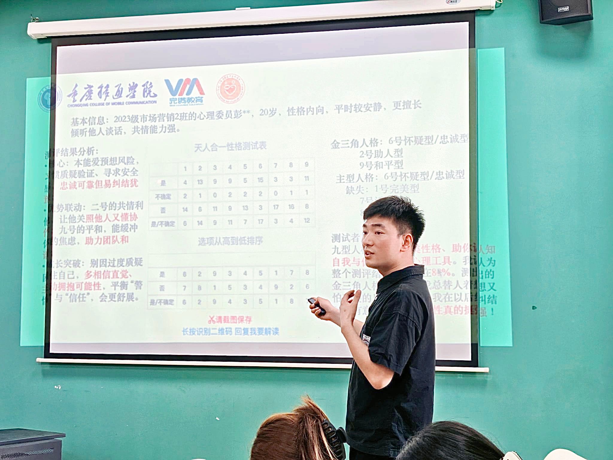 活动现场,金政杕老师介绍了九型人格测试的原理,重点剖析了九型人格完整版180题专业测评系统及测评逻辑,以场景化问题分析测试者核心动机并匹配类型,同时进行现场互动实测。金老师以学生真实测评报告为案例进行现场演示数据解读方法,通过选项数量排序锁定主型人格(核心特质)、金三角人格(三大优势类型)及漏洞人格(薄弱类型),精准把握个体核心特质、优势潜能及待发展领域,生动展示了人格分析在解决实际问题中的价值。