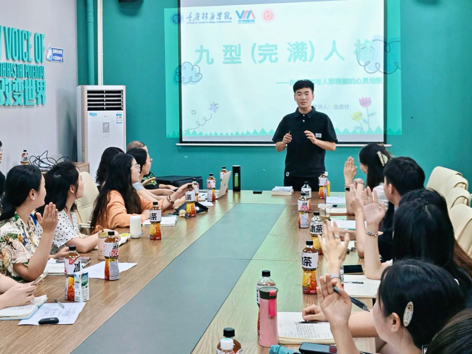 为提升辅导员队伍心理育人专业化水平,赋能学生心理工作精准化发展。淬炼商学院于6月13日上午10:00在花果书院大型会议室展开完满人格专题转训。本次转训由校心理健康教育与咨询中心兼职教师金政杕分享赴山东泰山科技学院学习“九型人格”,由淬炼商学院学工副院长刘薇唯,团总支书记黄新燕,学工办主任廖进以及全体辅导员共同参与。本次转训活动聚焦九型人格理论的应用实践,旨在通过科学工具赋能学生管理与心理辅导,助力辅导员掌握人格分析工具,提升育人工作科学性。