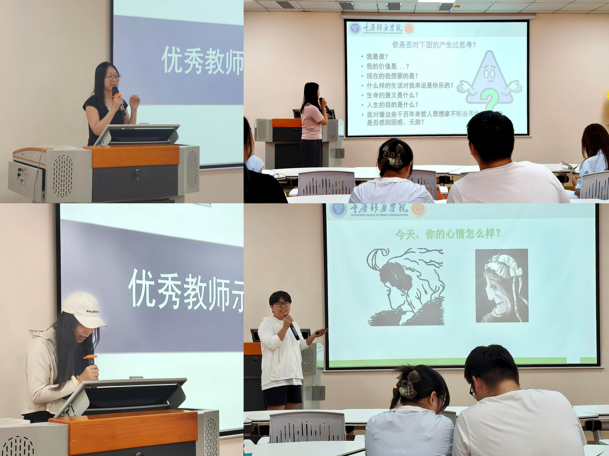 王雪燕老师首先围绕“完满涵育式”大学生心理健康教育课程体系进行阐述,确保学生在校期间全员全面接受系统心理教育,培育积极品质,促进心理成长。在试讲环节,苏畅老师等系统运用案例教学、情景模拟等多元化教学方法,依次围绕课程当中的核心知识点展开教学展示。