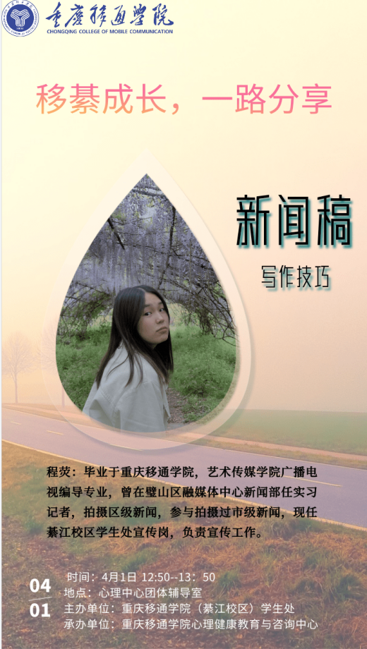 学有所专,也有全面发展。为提升心理委员综合能力,助力心理委员全方面发展,4月1日,在心理健康教育与咨询中心(以下简称心理中心)成功举行新闻稿写作技巧培训。培训由心理中心张纯霞老师主持,学生处程荧老师主讲。