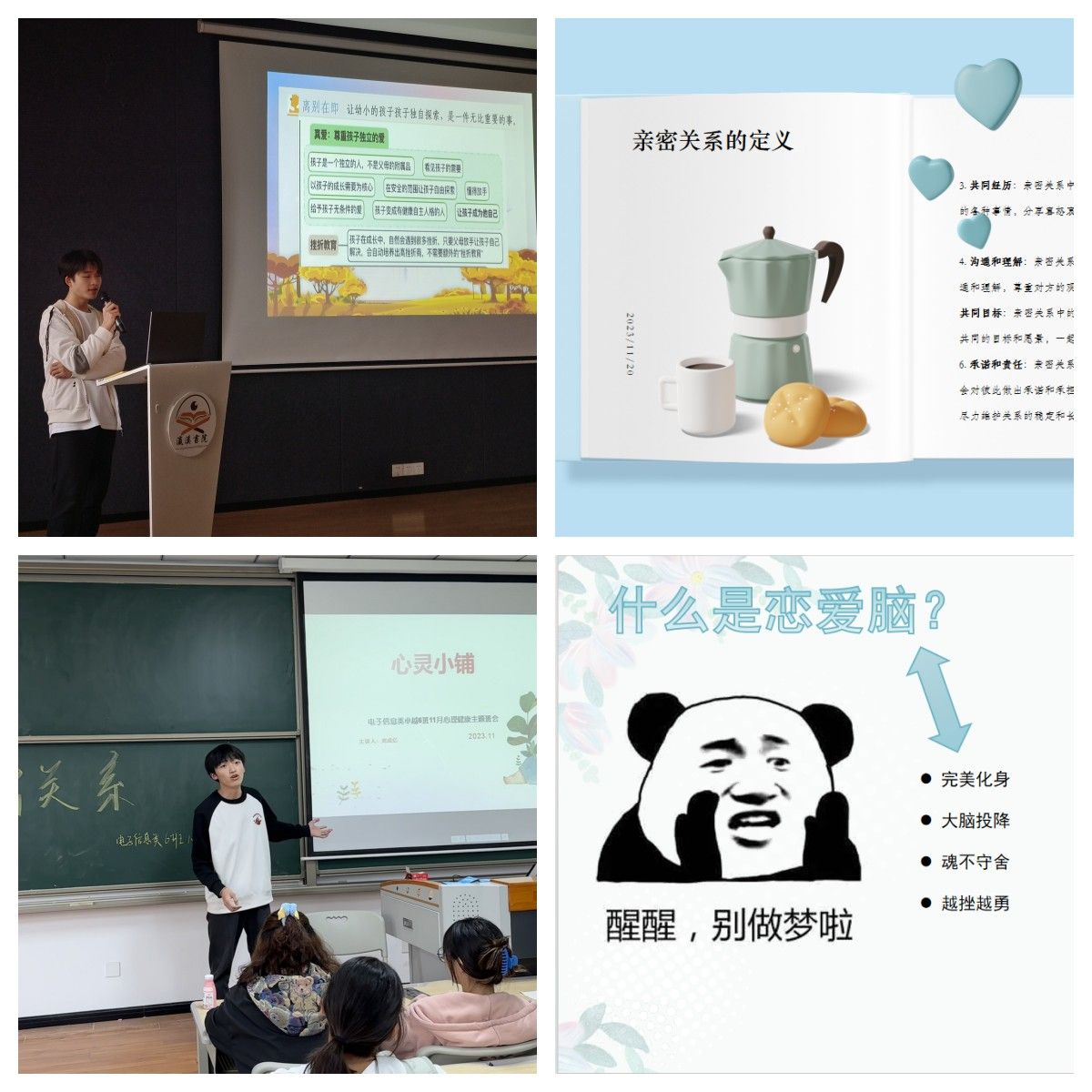 11月,心理委员们积极参与“爱情具象化”“为何家会伤人”“吵架也可以好好吵”等“亲密关系”主题系列讲座,对亲密关系有了更深刻的理解。他们结合11.25心理健康月所学知识,参考班级同学日常兴趣爱好,同时发挥自身兴趣和创造力开展了不少新颖的心理健康班会。最经典的班会形式是知识宣讲,可以起到思想引领的作用。2022级计算机学院计科10班心理委员谭馨辅以事例说明,在人际交往过程中应该保持真诚、信任和尊重,使同学们认识到良好的态度是人际交往的关键。