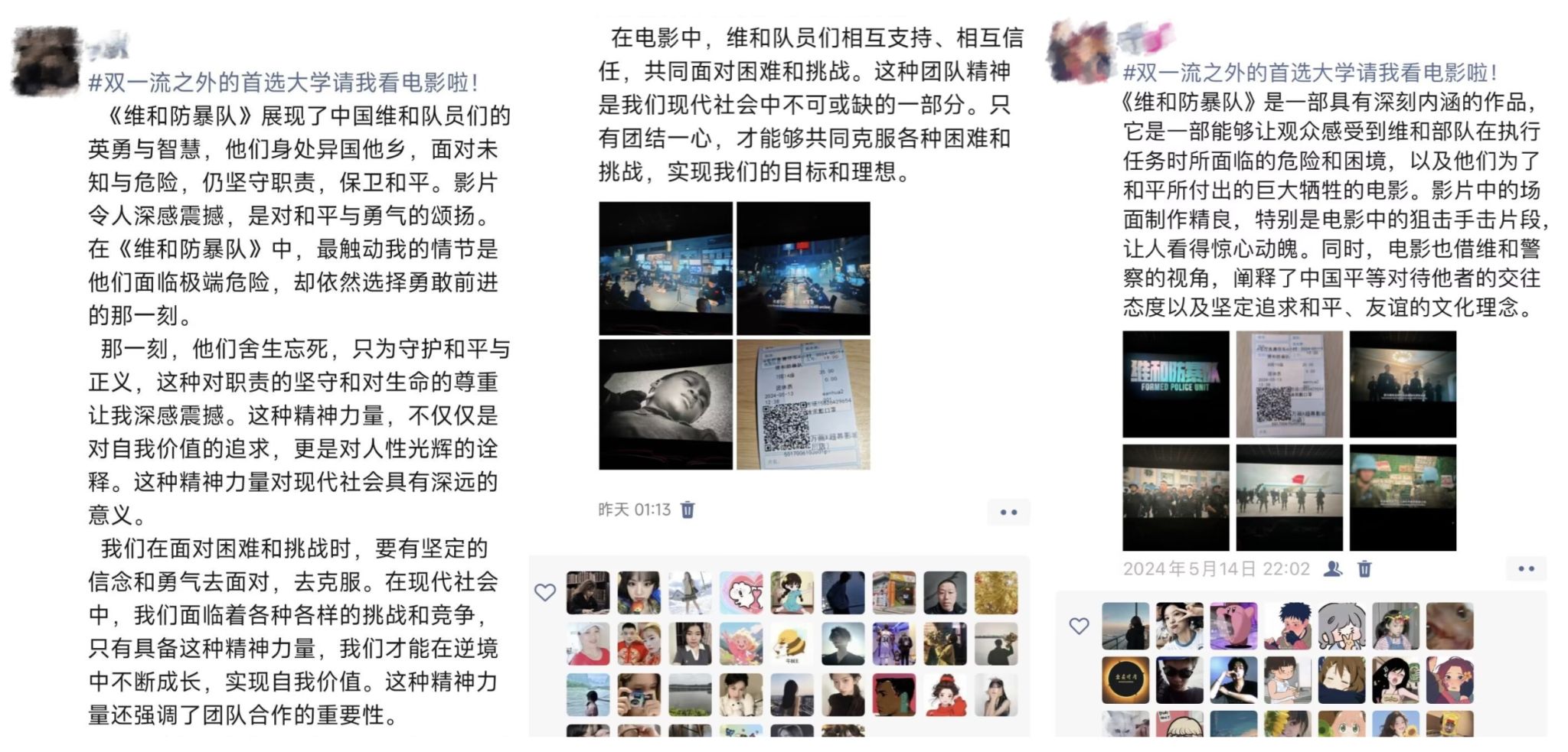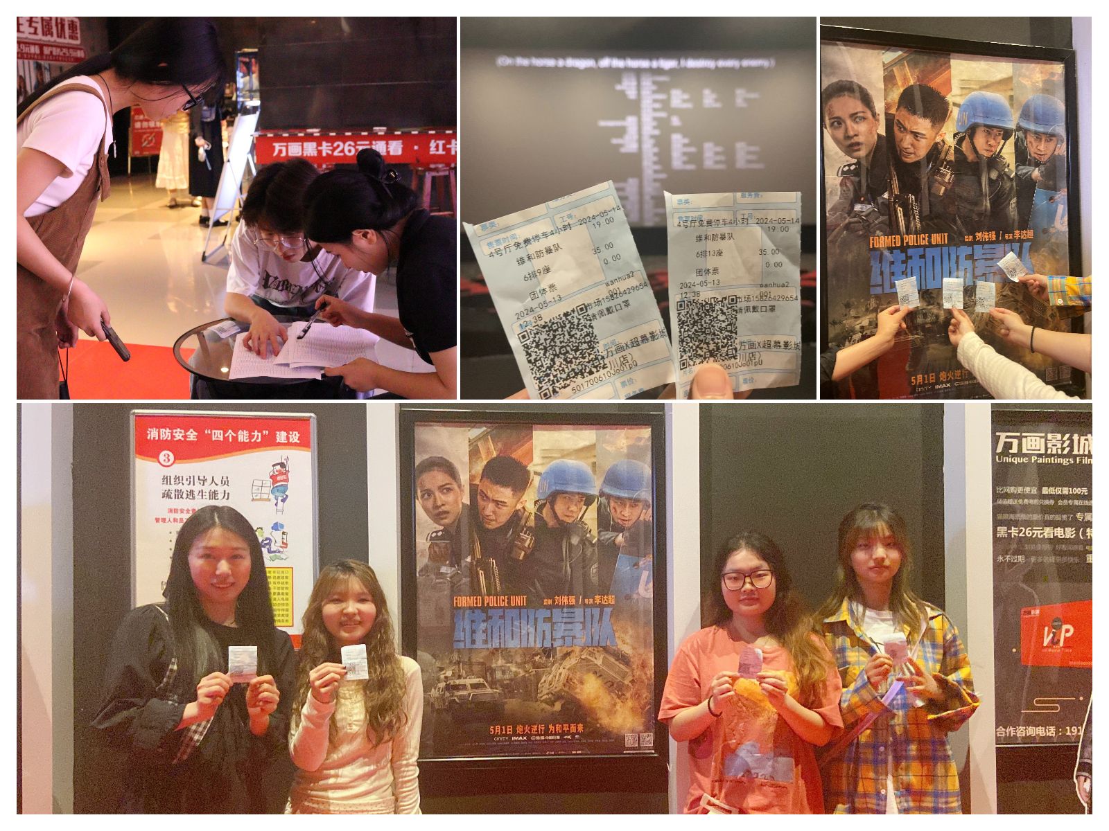 为进一步加强受助学生励志教育,积极引导学生传承五四精神,聚焦培养青春奋斗意识,激发学生的爱国热情和社会责任感,争做有理想、敢担当、能吃苦、肯奋斗的新时代好青年,引导受助学生从影片中汲取奋进力量,5月14日,“筑梦青春·影励前行”受助学生观影活动第3期于万画影城如期开展。本期为同学们选取了国防教育题材影片《维和防暴队》,同时本期活动还组织了各学院资助专项负责老师和学校国防教育宣讲团、国旗护卫队成员共同观影。