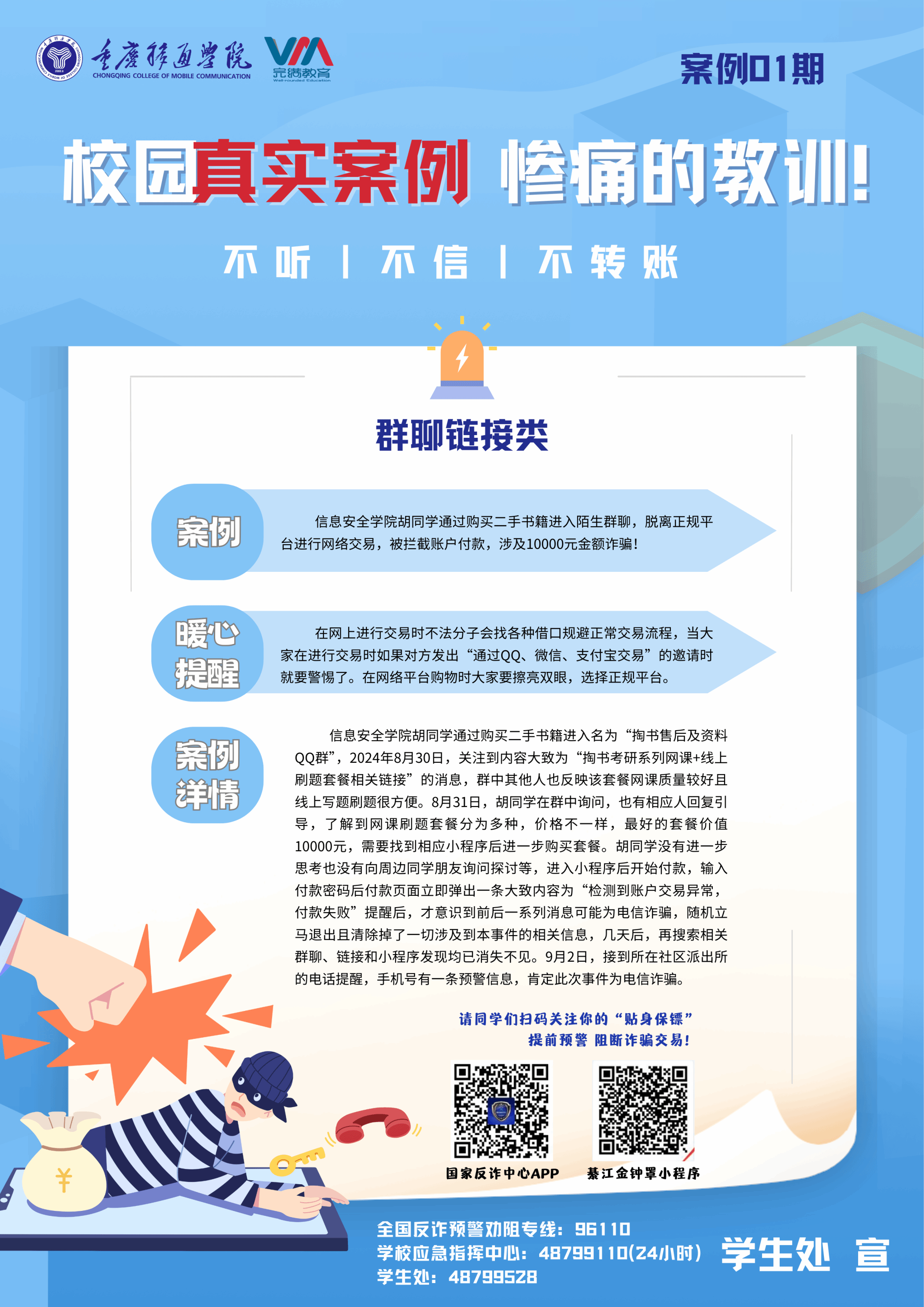案例详情:信息安全学院胡同学通过购买二手书籍进入名为“掏书售后及资料QQ群”,2024年8月30日,关注到内容大致为“掏书考研系列网课+线上刷题套餐相关链接”的消息,群中其他人也反映该套餐网课质量较好且线上写题刷题很方便。8月31日,胡同学在群中询问,也有相应人回复引导,了解到网课刷题套餐分为多种,价格不一样,最好的套餐价值10000元,需要找到相应小程序后进一步购买套餐。胡同学没有进一步思考也没有向周边同学朋友询问探讨等,进入小程序后开始付款,输入付款密码后付款页面立即弹出一条大致内容为“检测到账户交易异常,付款失败”提醒后,才意识到前后一系列消息可能为电信诈骗,随机立马退出且清除掉了一切涉及到本事件的相关信息,几天后,再搜索相关群聊、链接和小程序发现均已消失不见。9月2日,接到所在社区派出所的电话提醒,手机号有一条预警信息,肯定此次事件为电信诈骗。