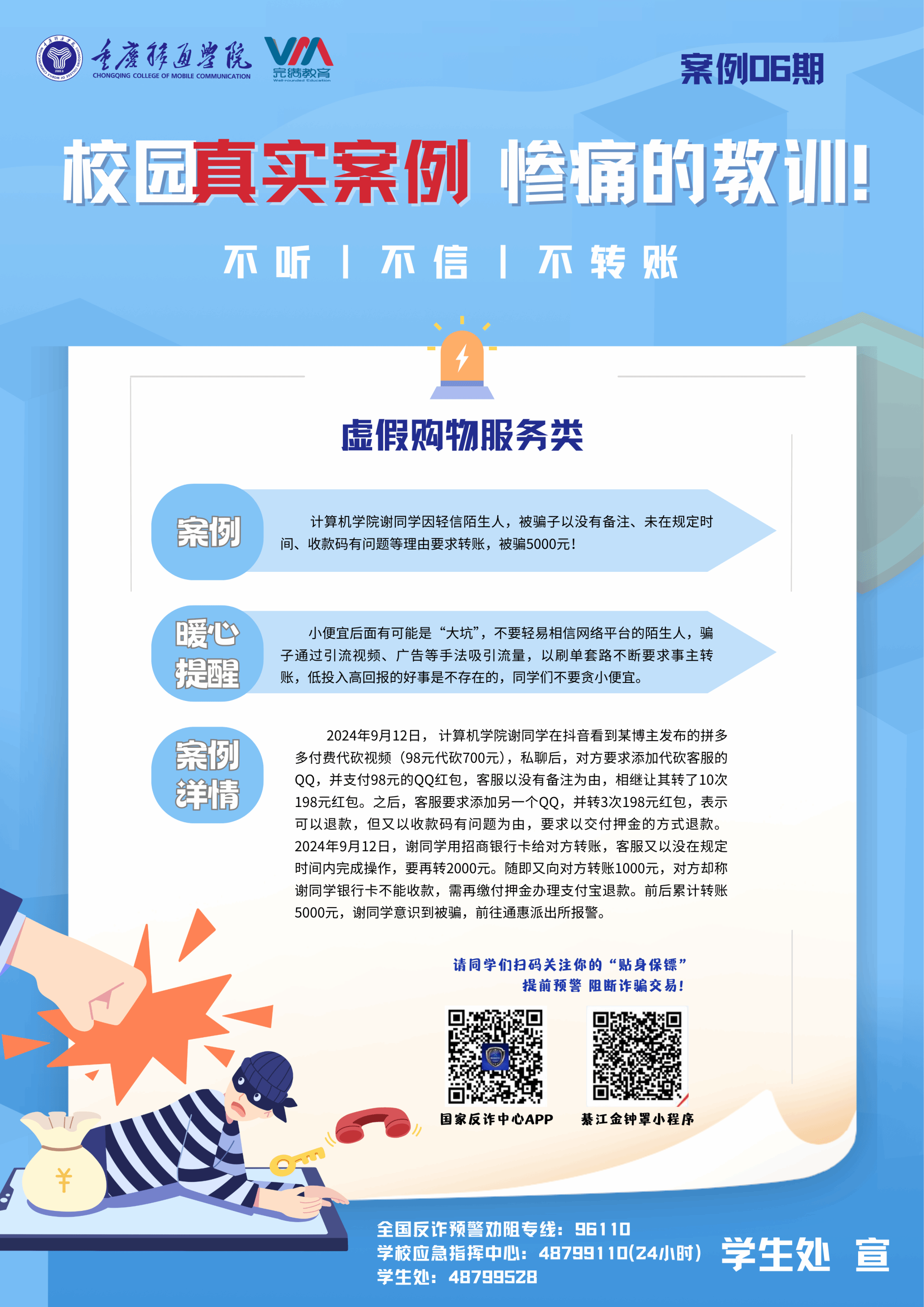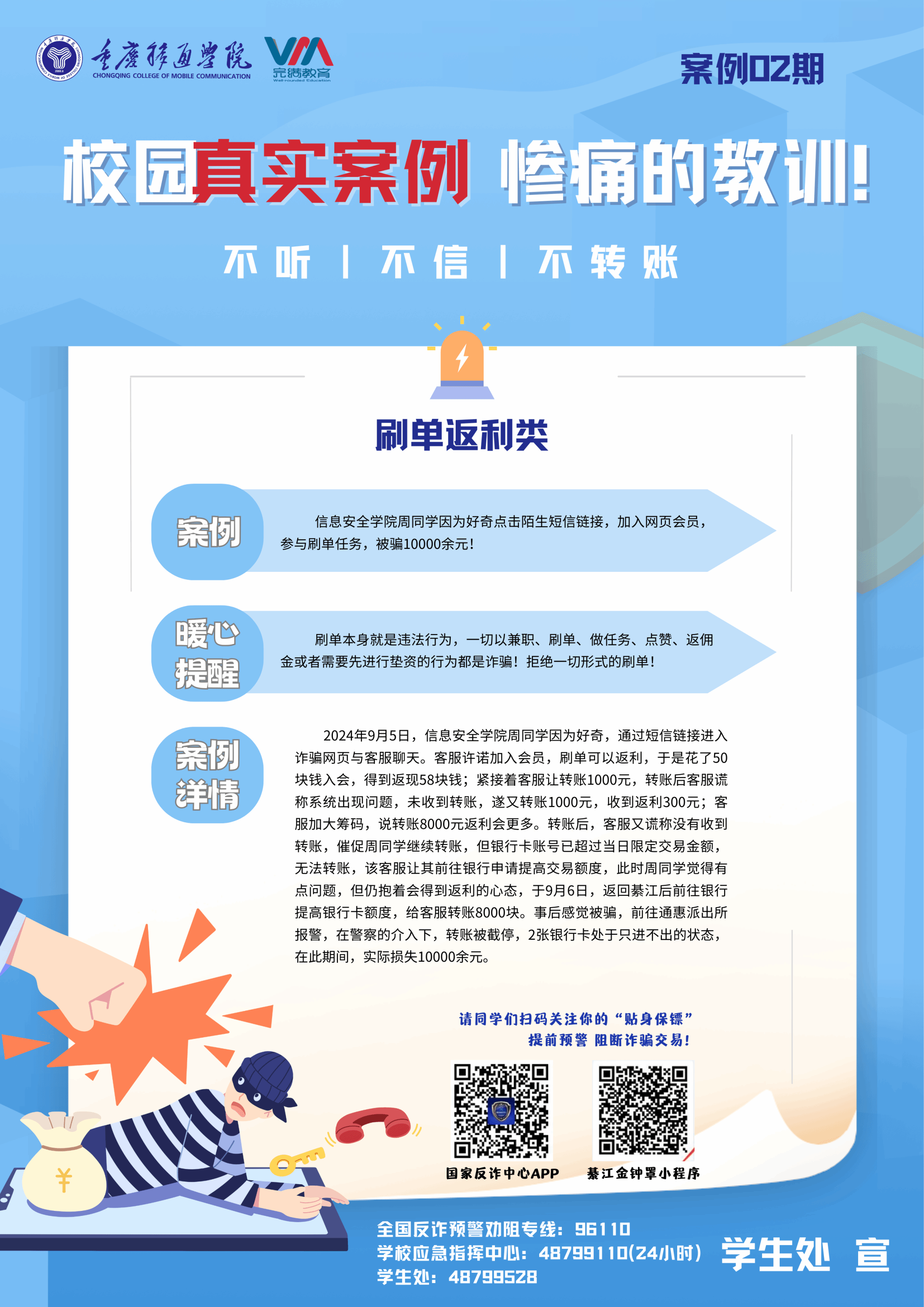 案例详情:2024年9月5日,信息安全学院周同学因为好奇,通过短信链接进入诈骗网页与客服聊天。客服许诺加入会员,刷单可以返利,于是花了50块钱入会,得到返现58块钱;紧接着客服让转账1000元,转账后客服谎称系统出现问题,未收到转账,遂又转账1000元,收到返利300元;客服加大筹码,说转账8000元返利会更多。转账后,客服又谎称没有收到转账,催促周同学继续转账,但银行卡账号已超过当日限定交易金额,无法转账,该客服让其前往银行申请提高交易额度,此时周同学觉得有点问题,但仍抱着会得到返利的心态,于9月6日,返回綦江后前往银行提高银行卡额度,给客服转账8000块。事后感觉被骗,前往通惠派出所报警,在警察的介入下,转账被截停,2张银行卡处于只进不出的状态,在此期间,实际损失10000余元。