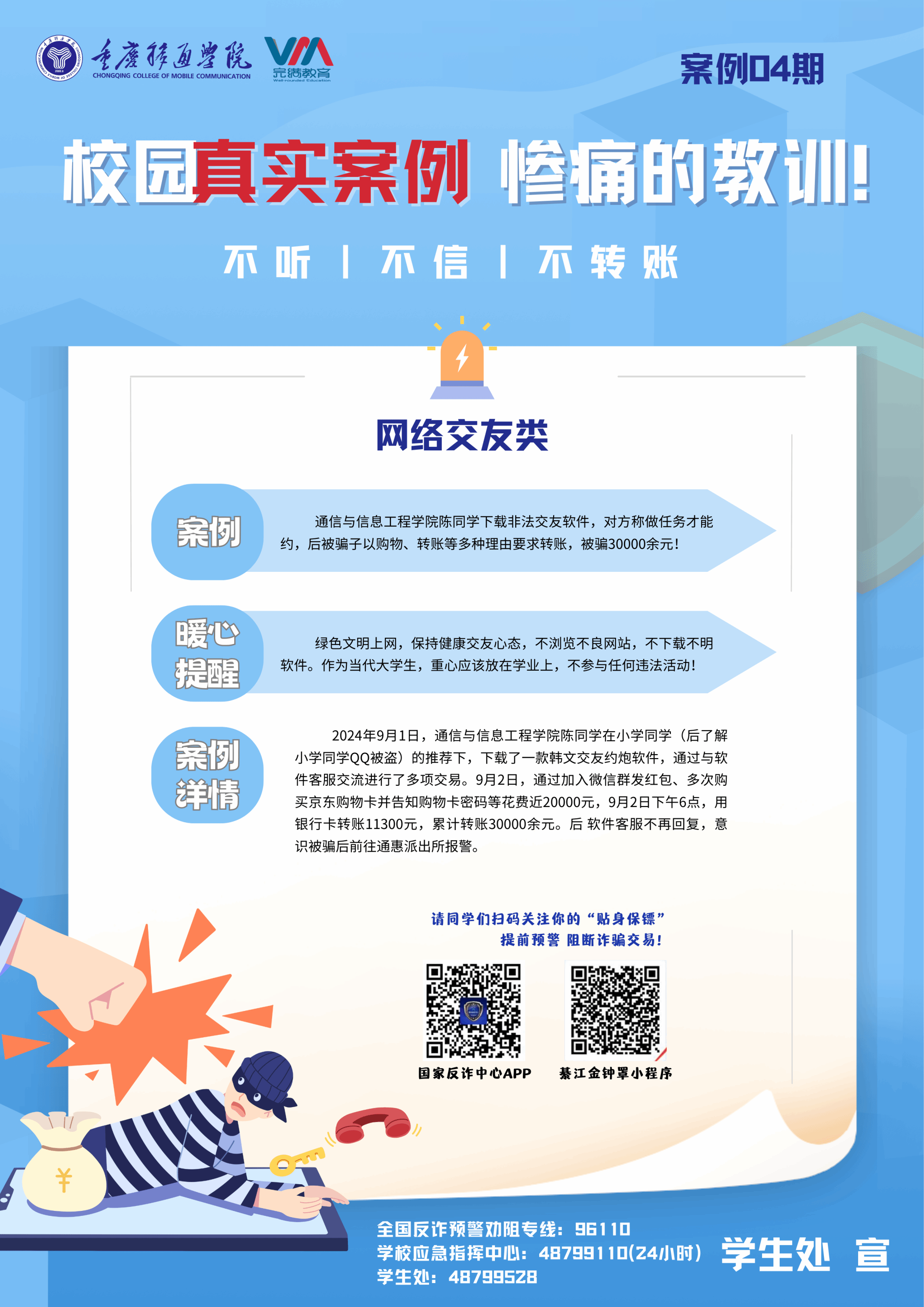 案例详情:2024年9月1日,通信与信息工程学院陈同学在小学同学(后了解小学同学QQ被盗)的推荐下,下载了一款韩文交友约炮软件,通过与软件客服交流进行了多项交易。9月2日,通过加入微信群发红包、多次购买京东购物卡并告知购物卡密码等花费近20000元,9月2日下午6点,用银行卡转账11300元,累计转账30000余元。后软件客服不再回复,意识被骗后前往通惠派出所报警。