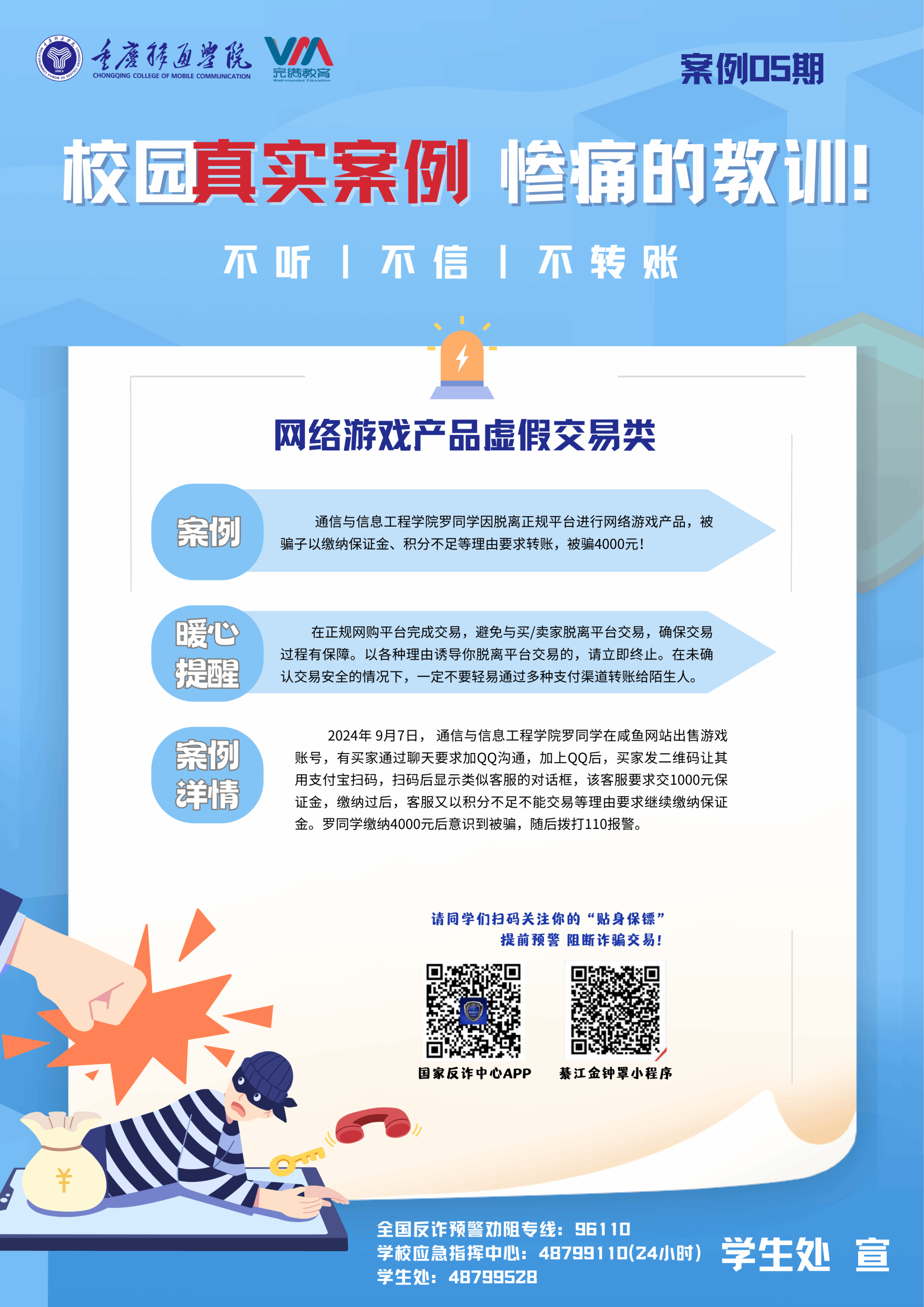案例详情:2024年9月7日,通信与信息工程学院罗同学在咸鱼网站出售游戏账号,有买家通过聊天要求加QQ沟通,加上QQ后,买家发二维码让其用支付宝扫码,扫码后显示类似客服的对话框,该客服要求交1000元保证金,缴纳过后,客服又以积分不足不能交易等理由要求继续缴纳保证金。罗同学缴纳4000元后意识到被骗,随后拨打110报警。