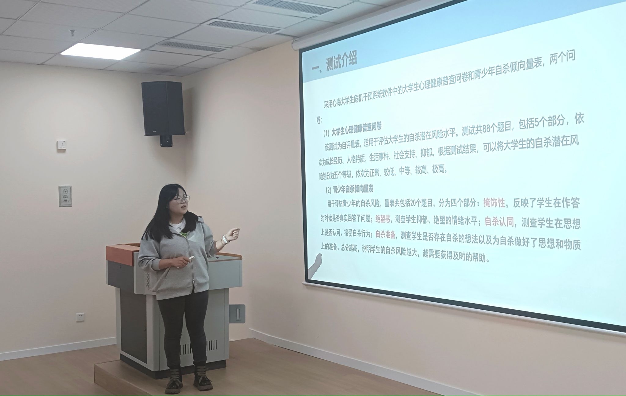 会议伊始,侯老师以教育部发布的《教育部办公厅关于全面加强和改进新时代学生心理健康工作专项行动计划(2023—2025年)》等文件要求阐述为什么要组织开展心理普查工作以及心理普查在大学生心理健康教育体系中的重要意义。她指出,一方面,文字具有引导性,心理普查问卷中的题目在一定程度上能够引发学生的思考,可以增强他们的心理健康意识,也是一种提高自我认识的方式。另一方面,对学校而言,通过心理健康普查能够了解学生入学后的心理状态,建立学生心理成长档案,同时筛查出心理适应不良的人群,为后续开展心理健康工作提供依据。随后,侯老师对心理普查的问卷、完成情况以及学生的心理健康状况水平进行了介绍和解读。其中侯老师强调,对于结果显示“异常”和没有进行测试的这两部分同学都要进行访谈和关注,避免因恐惧或担忧异样的眼光而逃避普测的少部分同学,要从多个维度掌握学生的心理健康状况。