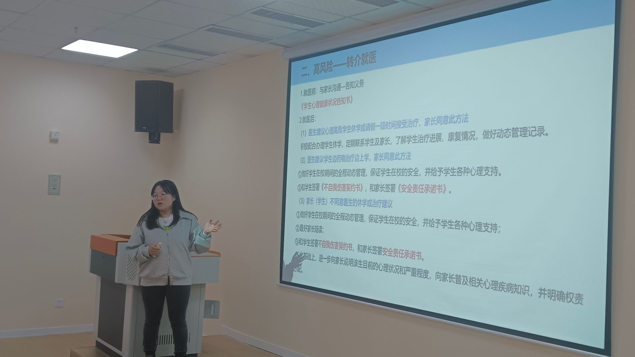 最后,侯老师还进一步明确了“高关怀”学生的工作流程,让辅导员老师能够对心理危机干预的整体流程和工作方向有更清晰地认知,比如对于需要常态化关注和追踪的学生,以周报的形式完善学生心理台账并与心理中心建立联系,对较高风险学生建立“一生一群”心理工作帮扶群等工作模式,共同帮助学生面对难关。