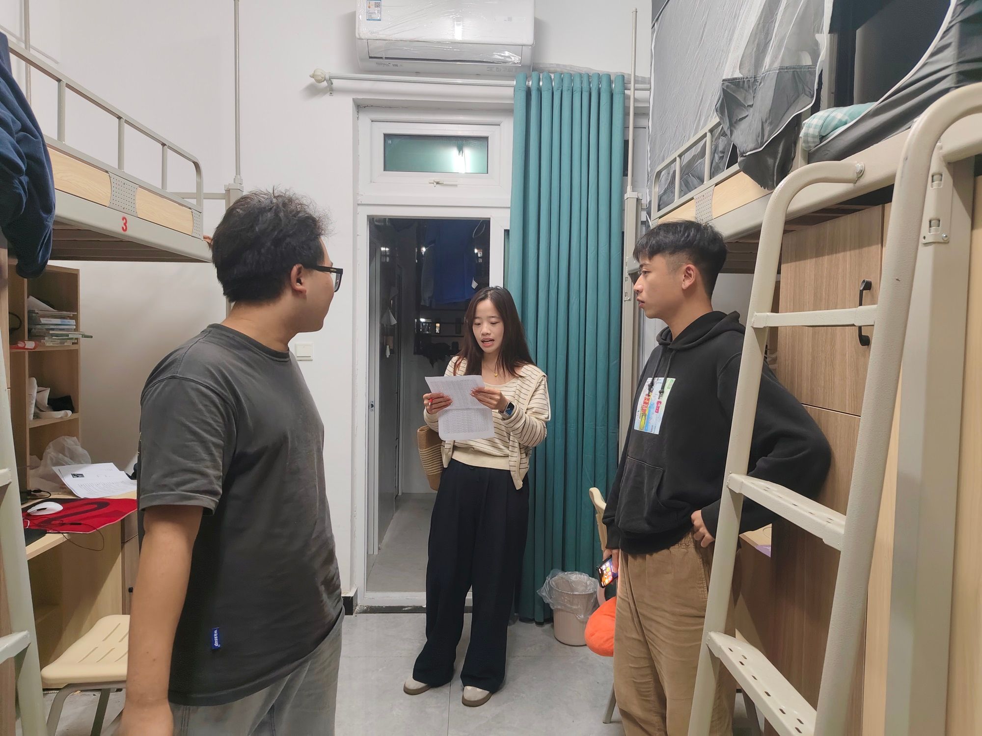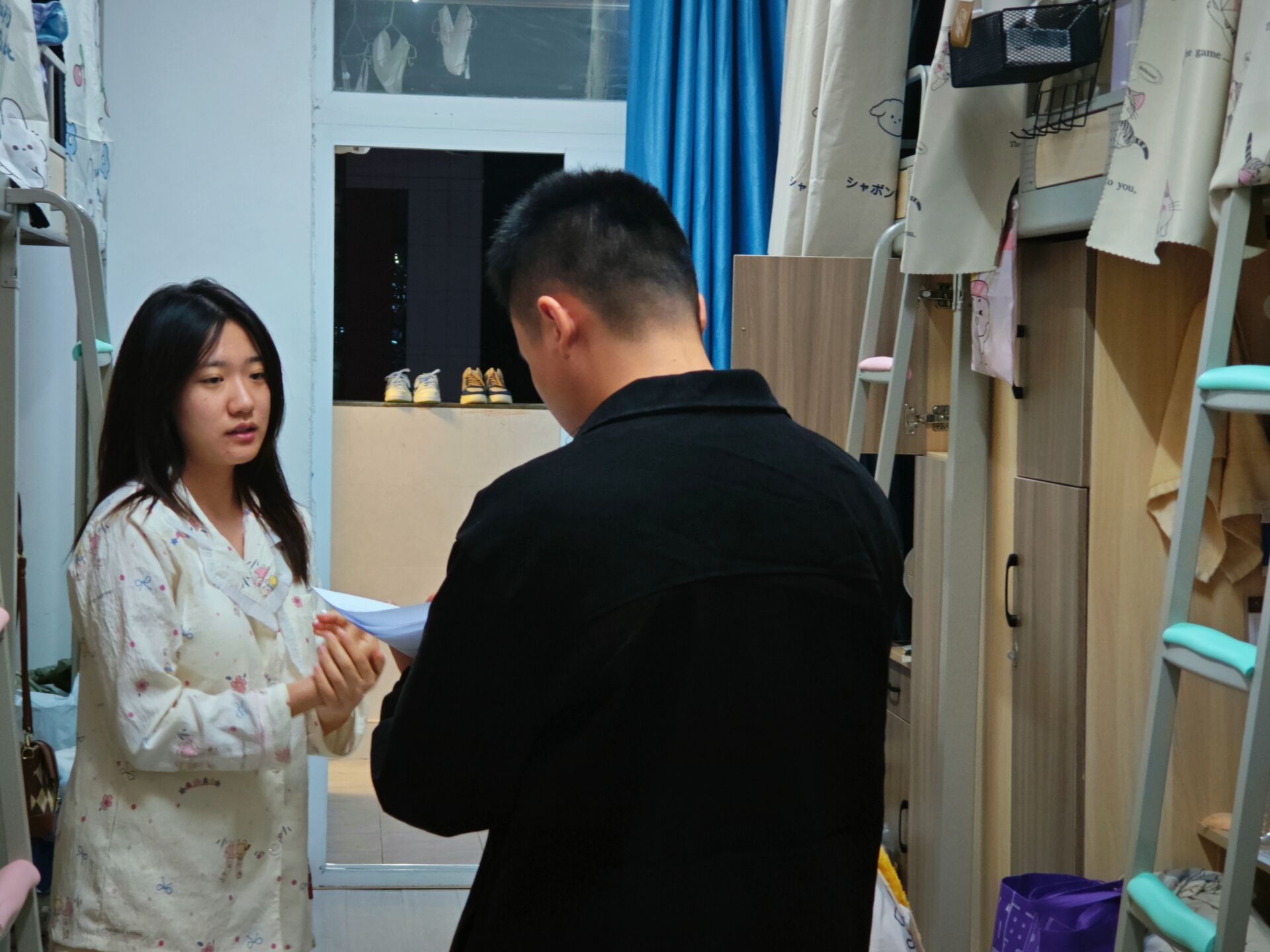同时,同学们也敞开心扉,向辅导员倾诉自己的烦恼与疑惑。辅导员们则耐心倾听,细致解答,搭建起了一座理解与沟通的坚实桥梁。此次查寝之行,不仅是对宿舍安全的一次例行检查,更是一次心灵的交流与情感的共鸣,让爱与关怀在师生之间传递。