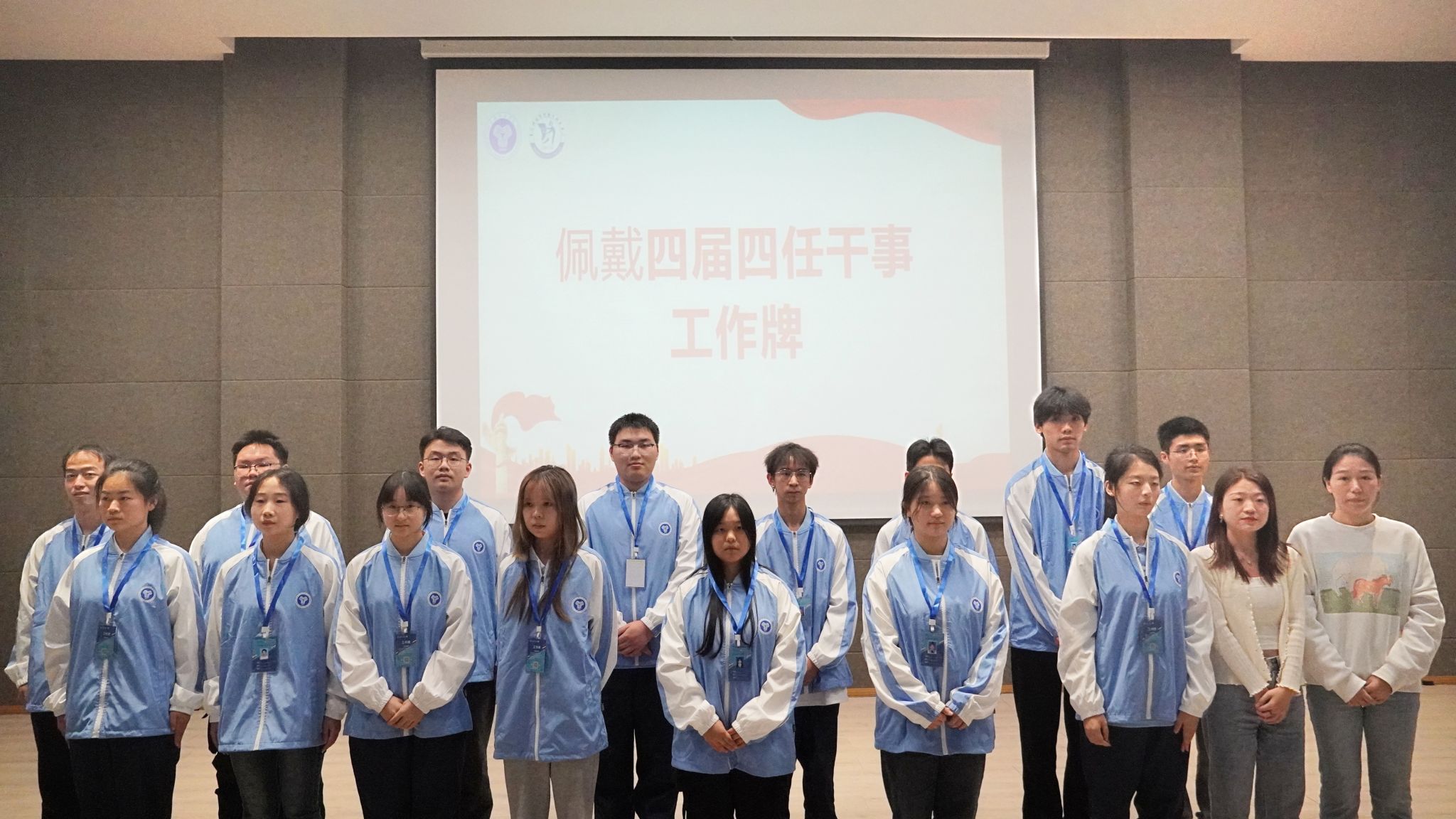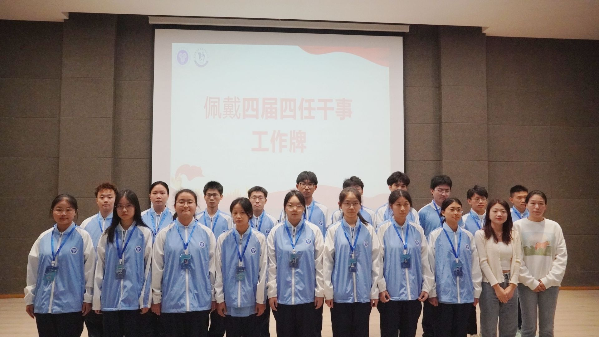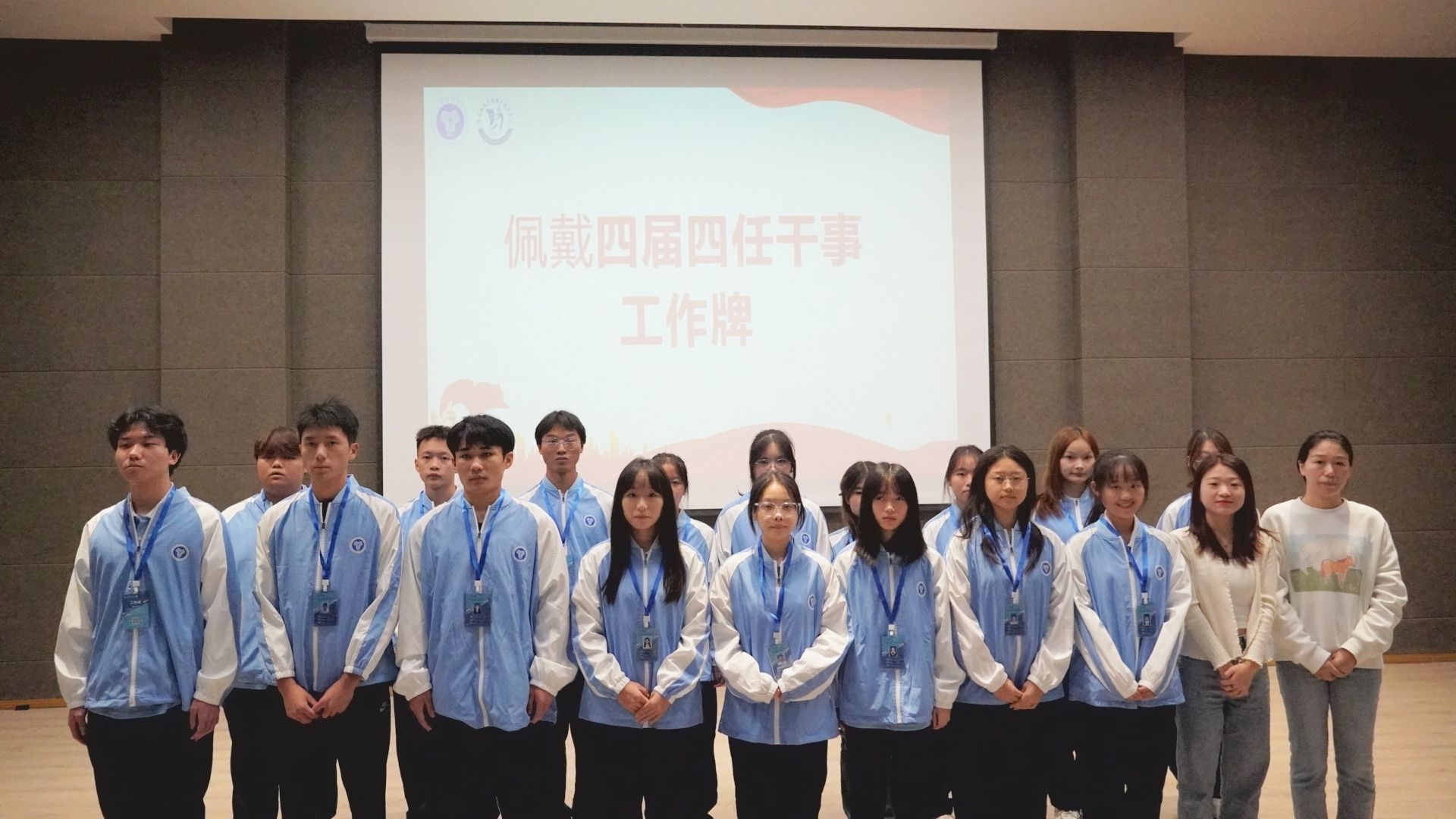 紧接着,为提升组织专业性,促进今后工作高效有序开展,学生处各位老师向四届四任的干部、干事们颁发聘书及工作牌。