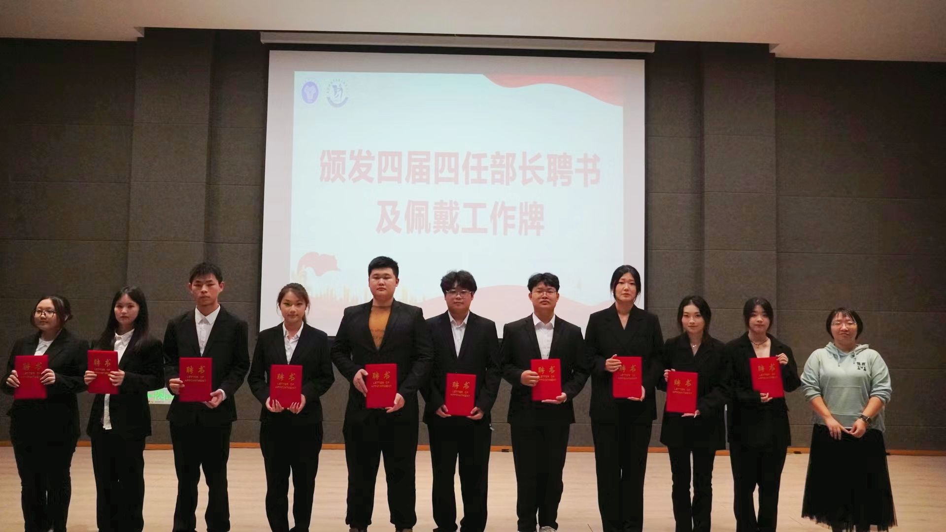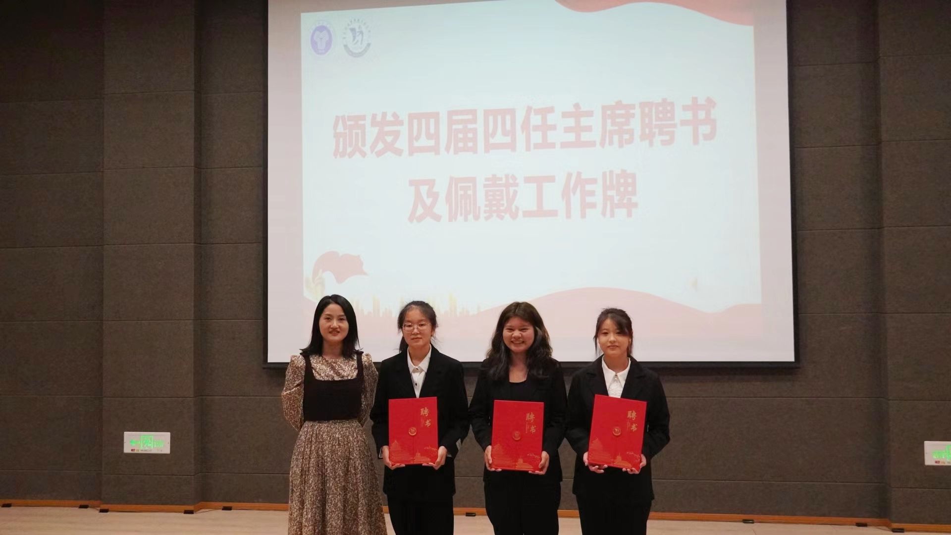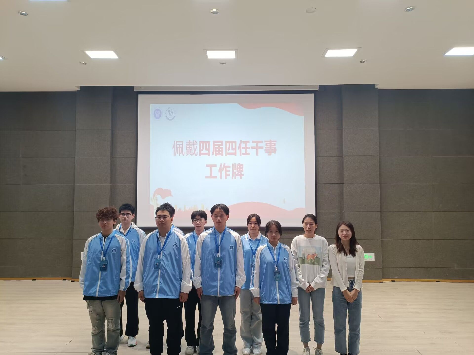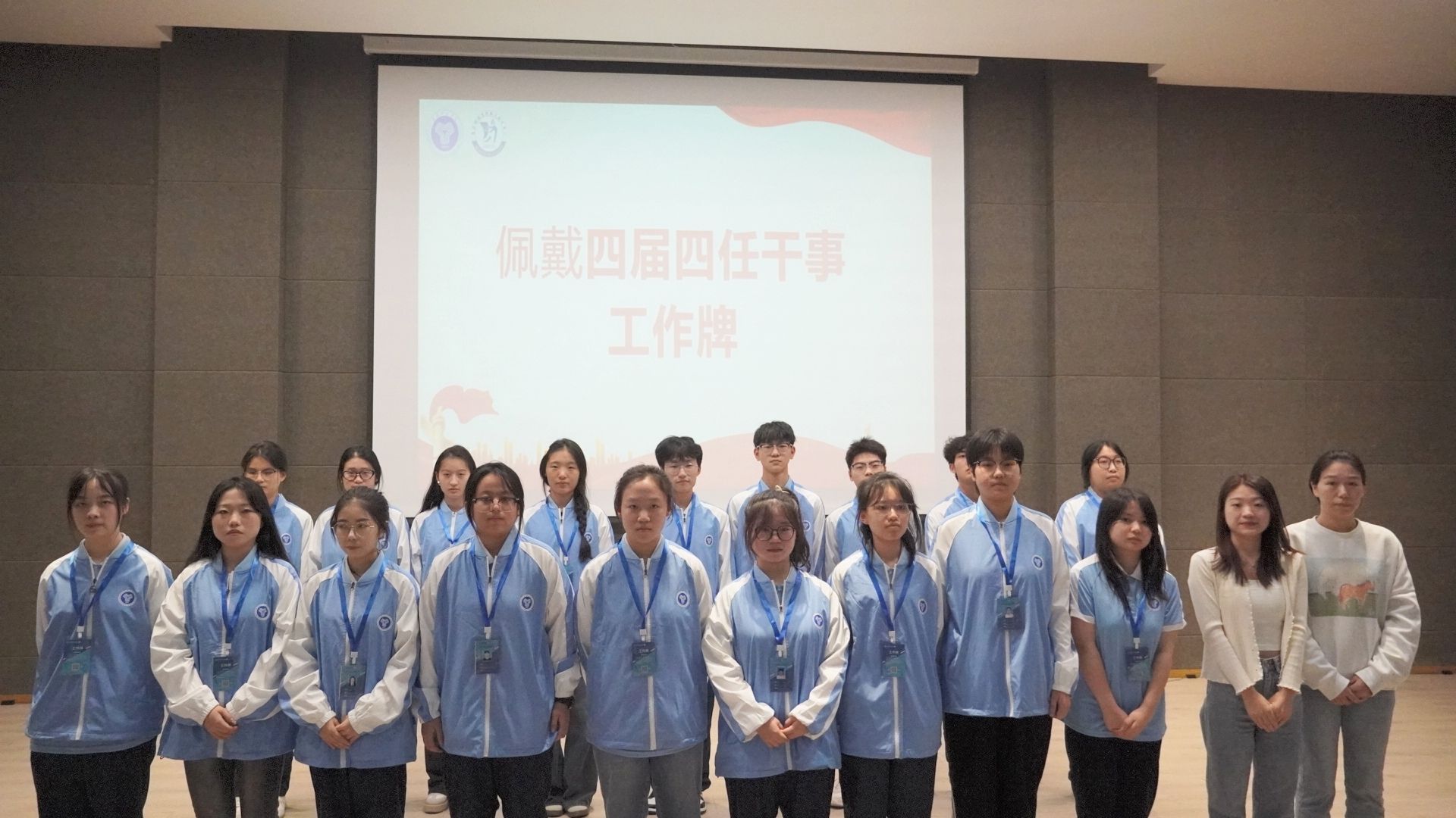 紧接着,为提升组织专业性,促进今后工作高效有序开展,学生处各位老师向四届四任的干部、干事们颁发聘书及工作牌。