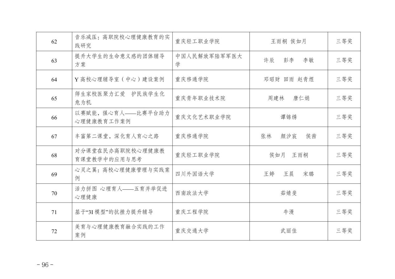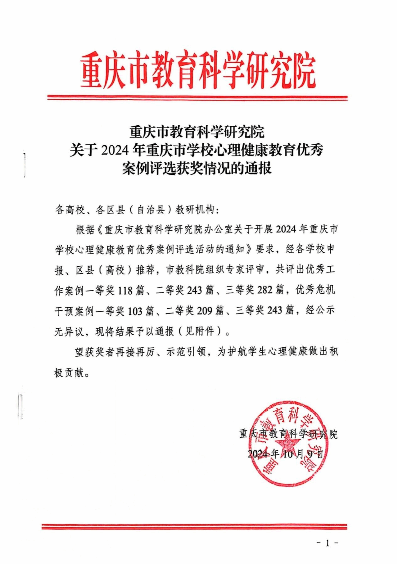 近日,我校积极参与由重庆市教育科学研究院主办的“2024年重庆市学校心理健康教育优秀案例评选活动”。本次评选旨在表彰在心理健康教育领域做出杰出贡献的个人和团队,推动心理健康教育的创新与发展。 经过激烈的角逐和专家的严格评审,我校提交的案例在众多优秀案例中脱颖而出,具体获奖情况如下: