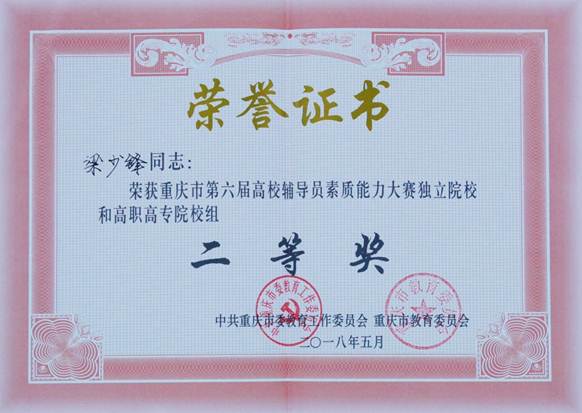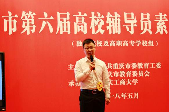 2018年5月9日-11日,由中共重庆市委教育工委、重庆市教育委员会主办的重庆市第六届高校辅导员素质能力大赛在重庆工商大学南岸校区举行。来自全市各大本科院校、独立院校以及高职高专学校的80名选手齐聚重庆工商大学,我校选派的通信与物联网工程学院辅导员梁少锋老师经过三天激烈的角逐,在独立院校及高职高专学校组42人中脱颖而出,获得二等奖的佳绩。