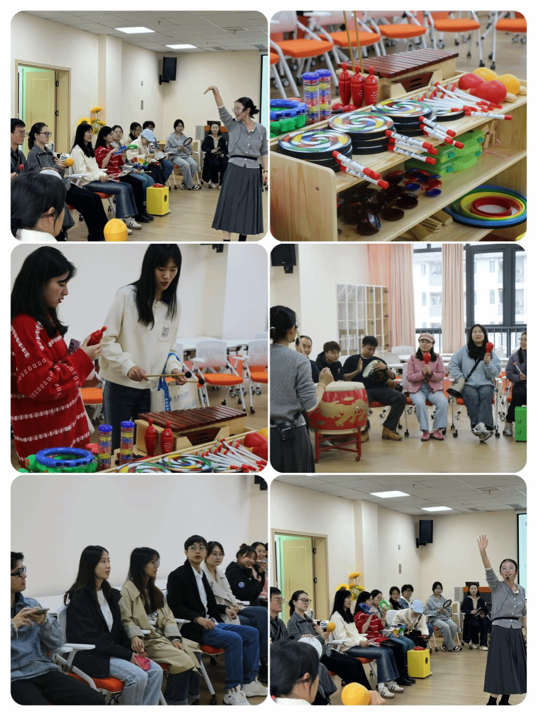 听觉是唤起和调节情绪、促进自我认知的重要感觉形式。鼓圈音乐治疗是一种独特的即兴演奏式音乐治疗形式,将不同的乐器声响交织在一起,形成一首和谐的人际交往曲。活动中,老师们围坐成圈,在谢沅红老师的指导下,挑选自己喜欢的乐器跟随节奏加入这场合奏。他们全神贯注,跟随着节奏或轻敲、或重打,身心积极性被充分调动,在欢快的旋律和轻松氛围中,跟随节奏感展现天性,表达友善与热情。