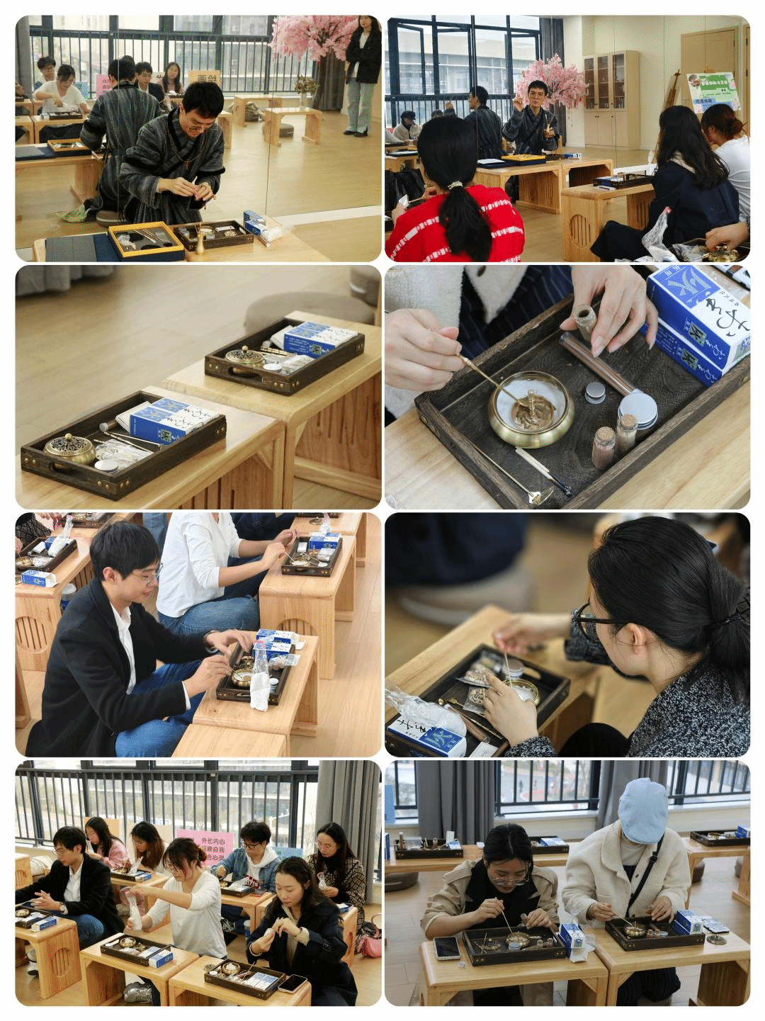嗅觉与情感、记忆紧密相连,是独特的情感触发感知,可以让我们忆起往昔的平静与美好。而香道是历史悠久的中国传统生活艺术的升华,通过识香、香技呈现和香法修练等环节,使人体会人生和感悟生活。各位老师跟随胡挽澜老师的引导,了解中国香道基础知识并进行实际操作,在制作香篆与冥想时,老师们屏息凝神,感受心神合一的状态,在香的沉静气味中,清理思维、摒弃杂念,回归内心。