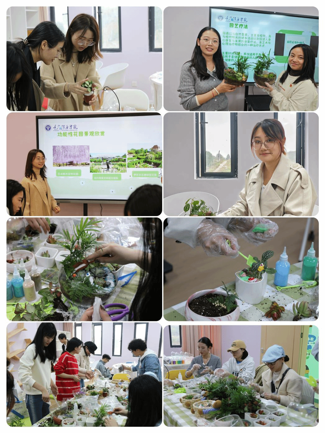 触觉能给人们带来安全感、舒适感,舒缓情绪。园艺疗法就是通过实际动手接触并运用园艺材料,在各类园艺活动中增强自信和培养责任感。在李东芹老师的讲解与带领下,老师们运用手中植物自由发挥和创作属于自己的微观盆景,并赋予作品专属意义。在接触泥土和植物时感受其特殊触感,借此触摸心流,通过触觉充分地放松和沉浸自我。