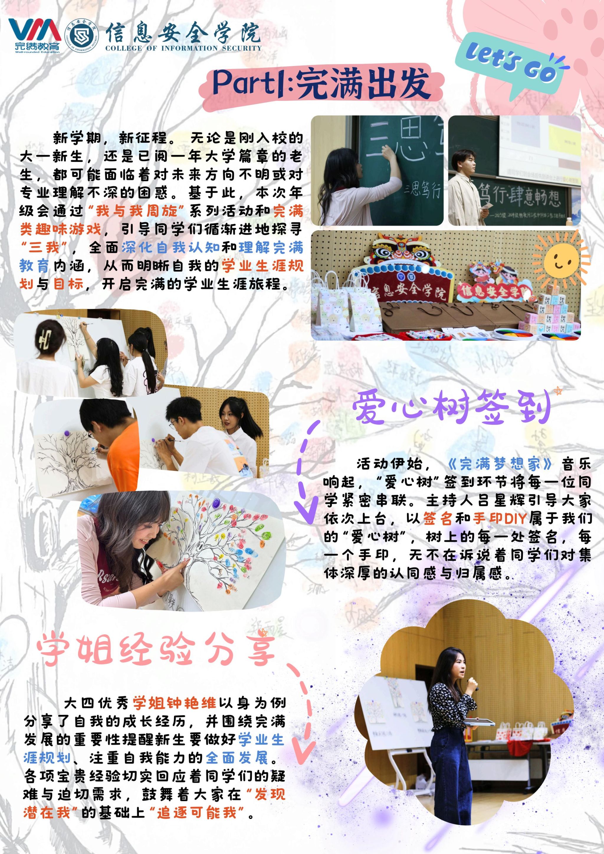活动伊始,同学们共同绘制“爱心树”进行签到,增强参与感、集体认同感与归属感,为活动营造团结温馨的氛围。“三我”引领环节,通过视频分享、新生与学姐经验交流,助力新生在新阶段寻找潜在我、探索可能我、追逐理想自我。
