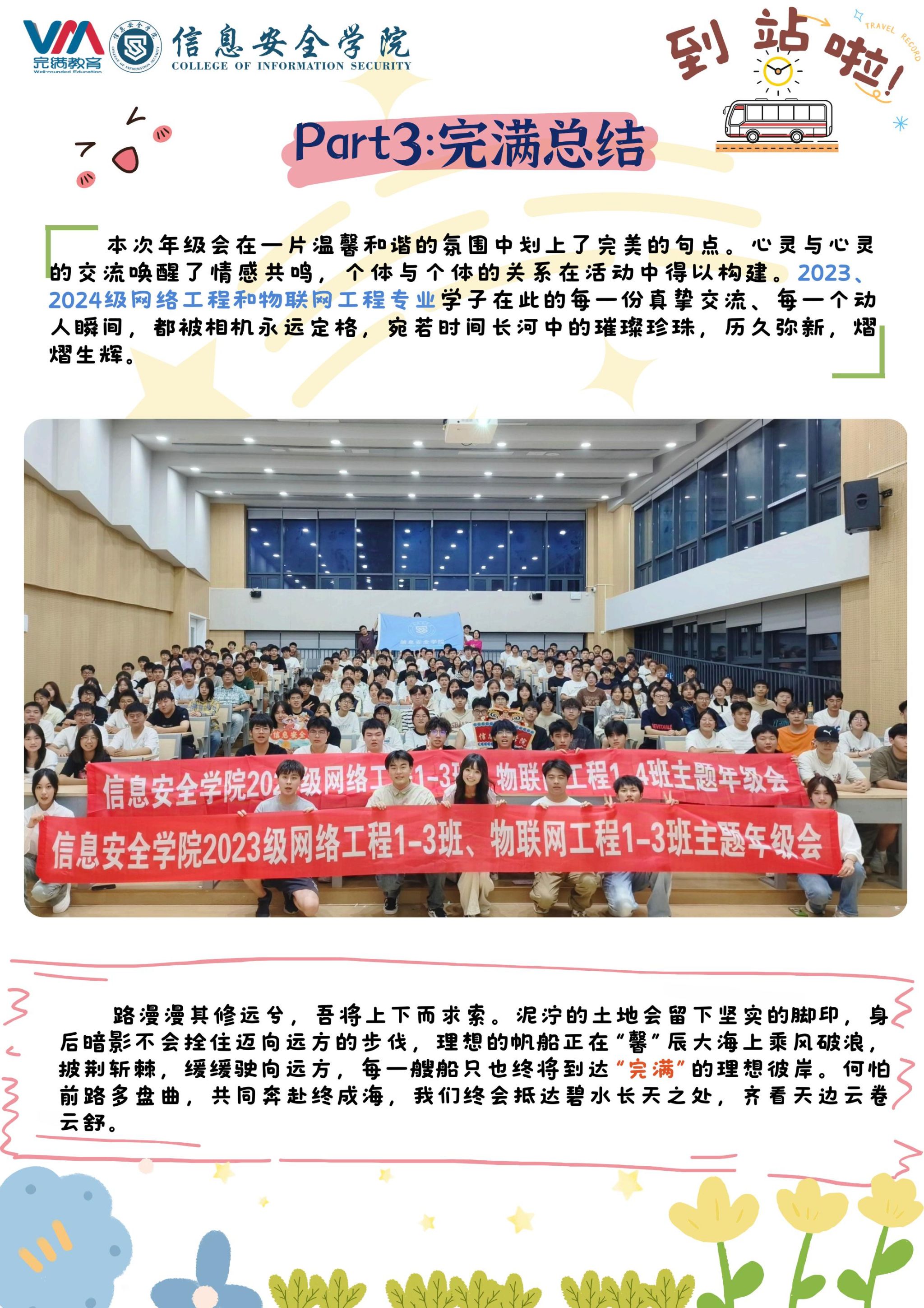 主题年级会是我校大学生思想政治教育的重要环节,是我校完满教育开展的重要形式,它将贯穿学生整个大学生活。通过不同形式的主题年级会,不仅帮助学生形成良好的学习认知,了解学校的规章制度,培养安全法治意识,更重要的是让学生在四年的大学生活中,养成良好的学习习惯与行为习惯,促进学生的全面成长。