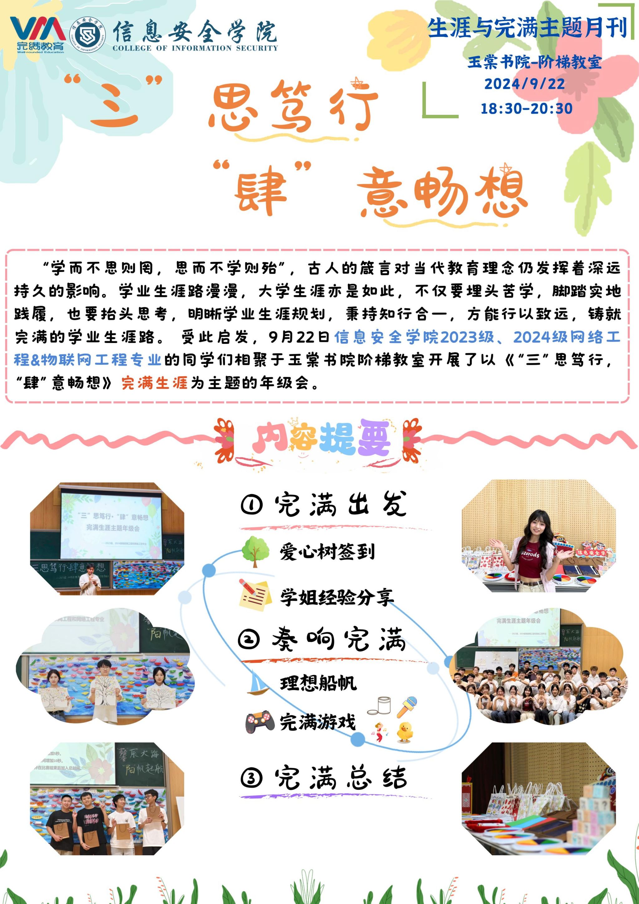 经验分享:本次年级会恰逢新学期开学,以“‘三’思笃行,‘肆’意畅想”为主题,希望以“老带新”,帮助同新生了解完满教育,做好大学四年初规划。