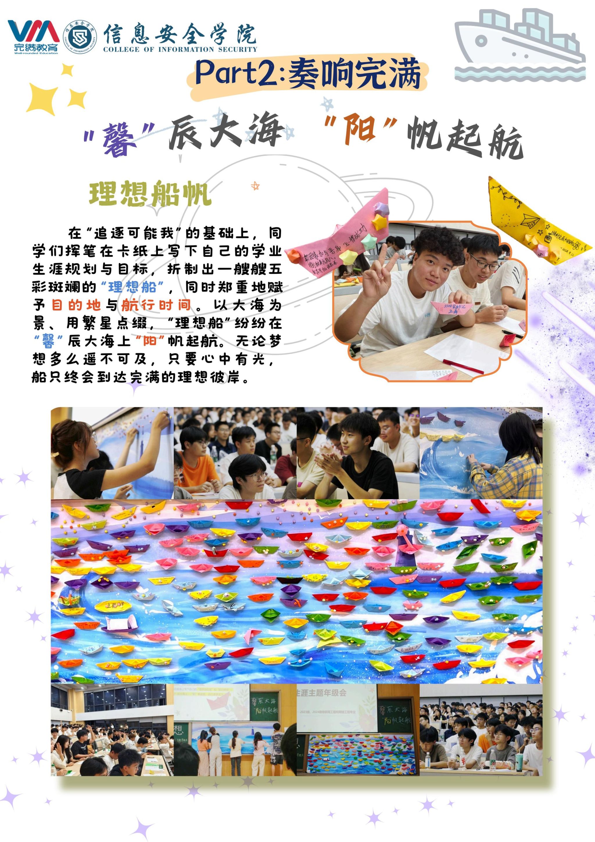 “理想船”启航仪式,将学业规划具象化,在卡纸上书分别写下自己的学业生涯规划,并将其折制成一艘艘五彩斑斓的“理想船”。以大海为景、用繁星点缀,同学们的理想船纷纷在“馨”辰大海上“阳”帆起航,向“理想我”靠近,坚定理想目标,强化前行决心。