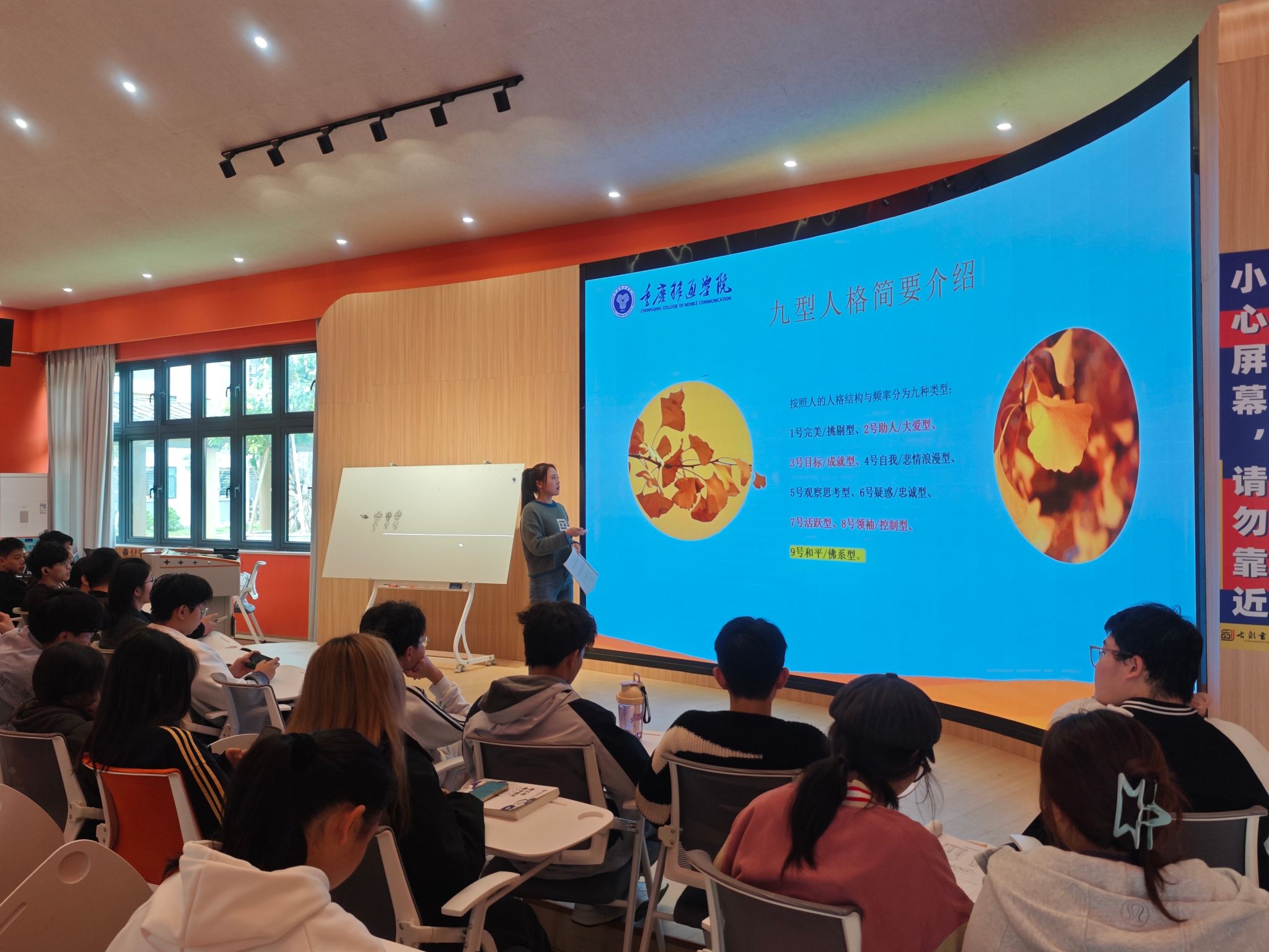 丁老师利用生动案例详细讲解九型人格的分类与特点。从1号完美/挑剔型到9号和平/佛系型,每种人格类型都被赋予了独特的性格特征和行为倾向。在讲解过程中,丁老师还特别强调了九型人格理论的应用价值。她认为,通过了解自己的人格类型,可以更加清晰地认识自己的职业倾向、情感需求与人际交往方式,从而在职场、学业与生活中做出更加明智的决策。鼓励学生们将九型人格理论应用于实际生活中,通过观察与分析身边人的性格类型,提升人际交往的能力与技巧。