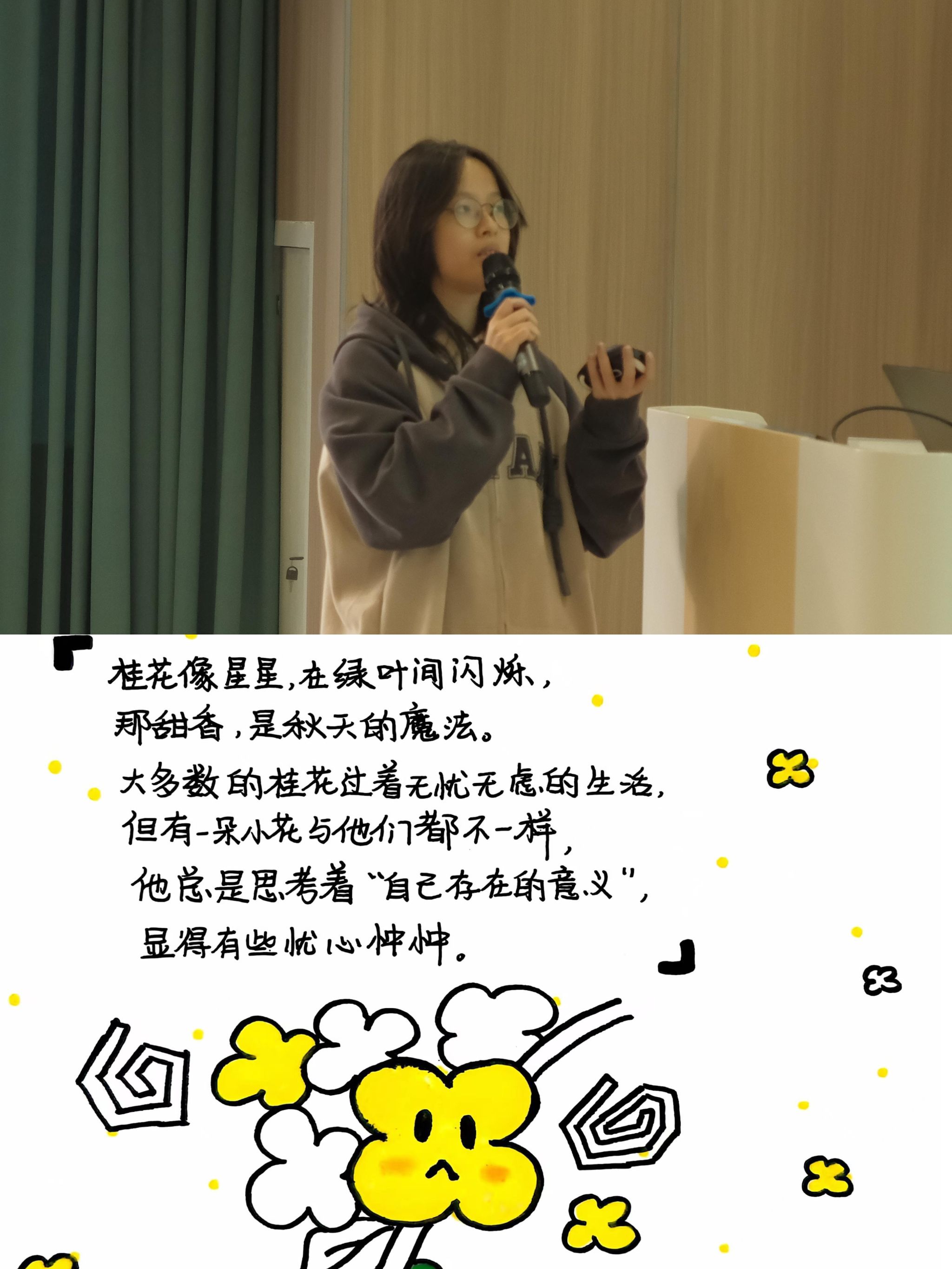 第六组是由蒲晨语和肖睿洋带来《桂花浮玉》。桂花,那淡淡的清香,总能勾起我们无尽的遐想,在桂花飘香的季节里,去领略走进那个诗意盎然的世界。通过一系列独具创新性与独特性的绘本描述桂花与自我、与梦想、与现实的深层次联系,最终诠释与升华出桂花的花语——收获与美好。
