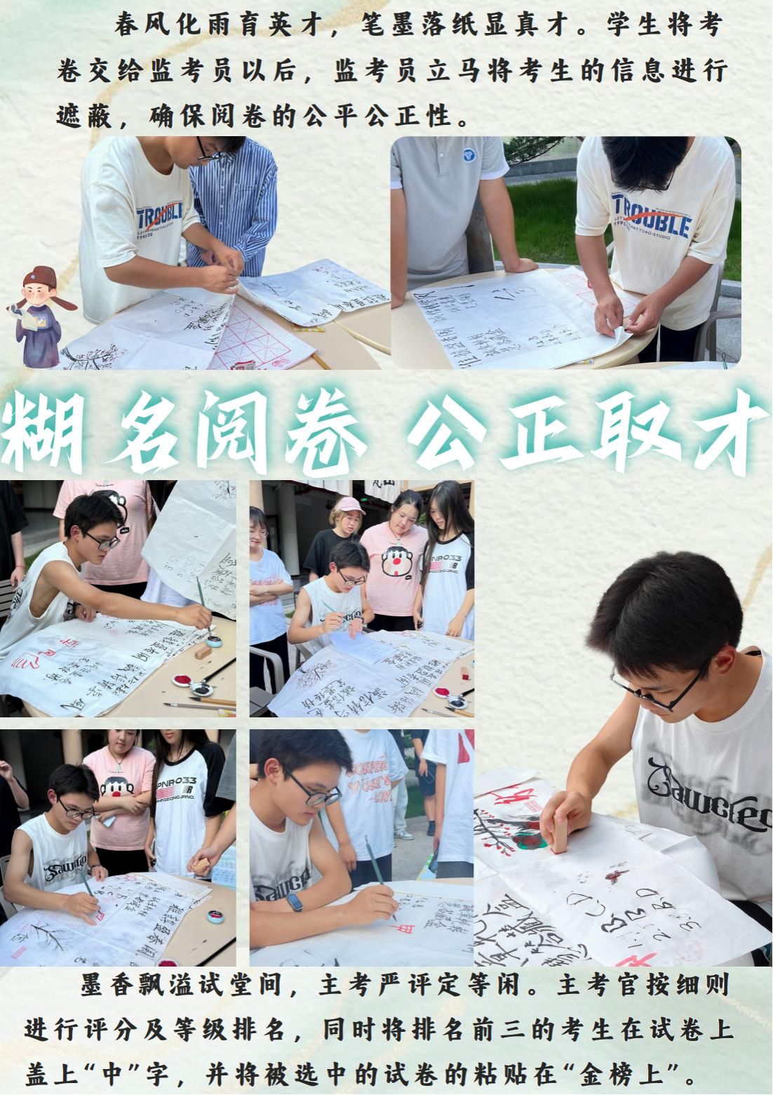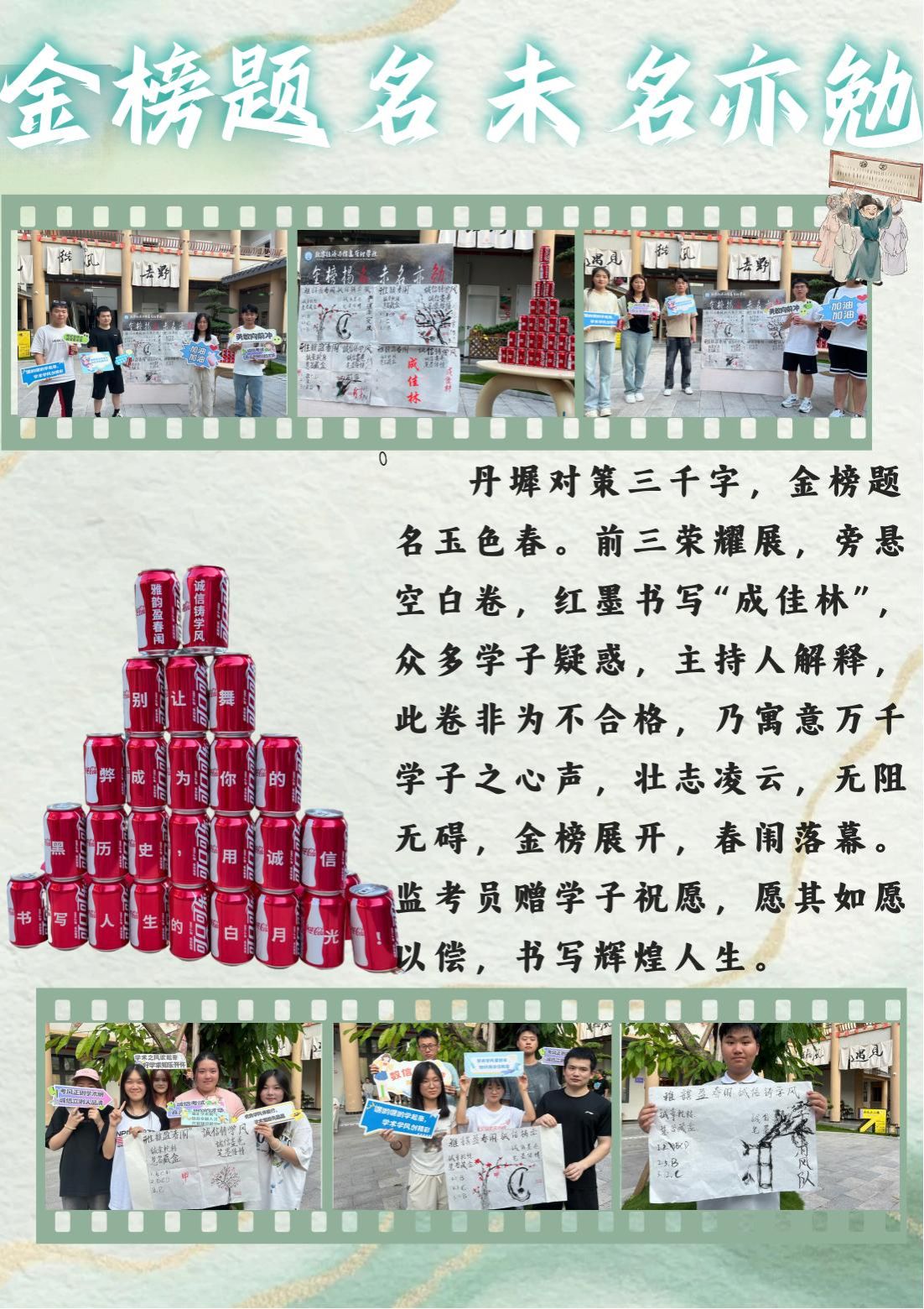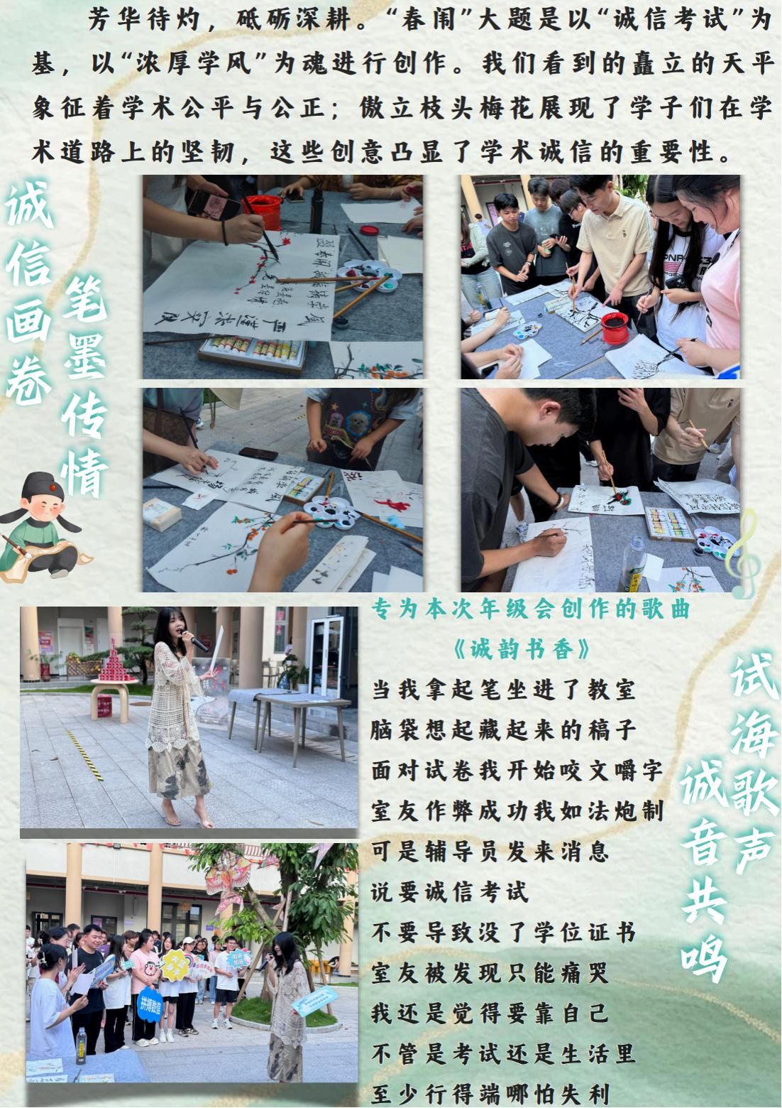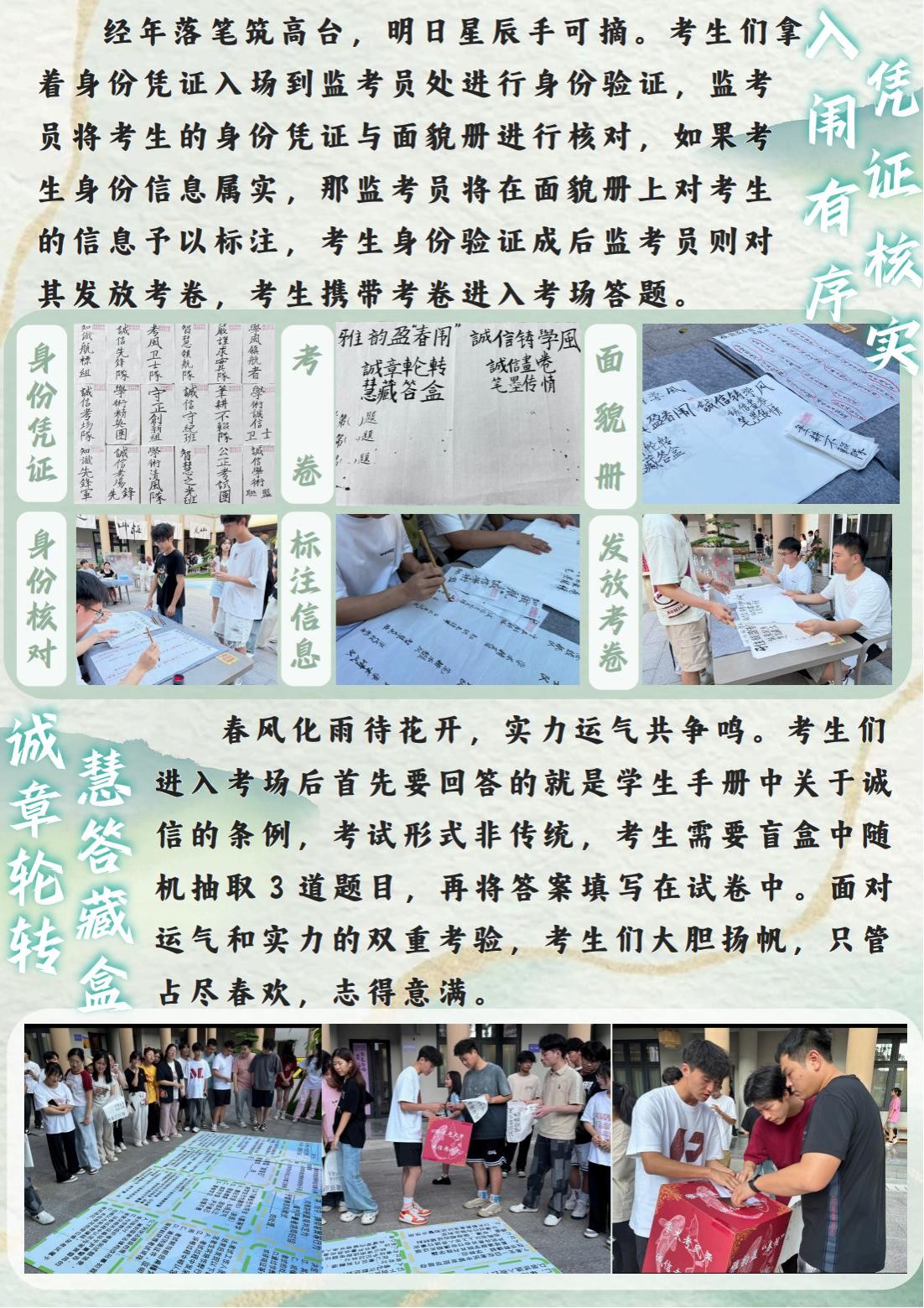 年级会围绕“诚信考试”主题,精心策划了六大环节:首先,环节一“凭证核实,入闱有序”,考生凭证入场,考官核验身份后分发试卷;接着,环节二“诚章轮转,慧答藏盒”,考生抽取《学生手册》中的诚信题目作答;随后,环节三“诚信画卷,笔墨传情”,考生围绕主题展开创意绘画,展现诚信精神;至此,考生完成作答并交卷。紧接着,环节四“试海歌声,诚音共鸣”,学生自创歌曲震撼亮相,以音乐弘扬诚信理念;之后,环节五“糊名阅卷,公正取才”,监考员遮蔽考生信息,公正评分,前三名考生试卷上榜,并特别展示一张空白试卷“成佳林”,寓意广大学子;最后,环节六“金榜扬名,未名亦勉”,金榜展示并颁奖,主持人阐释“成佳林”含义,鼓励所有考生勇敢追梦,书写精彩人生。