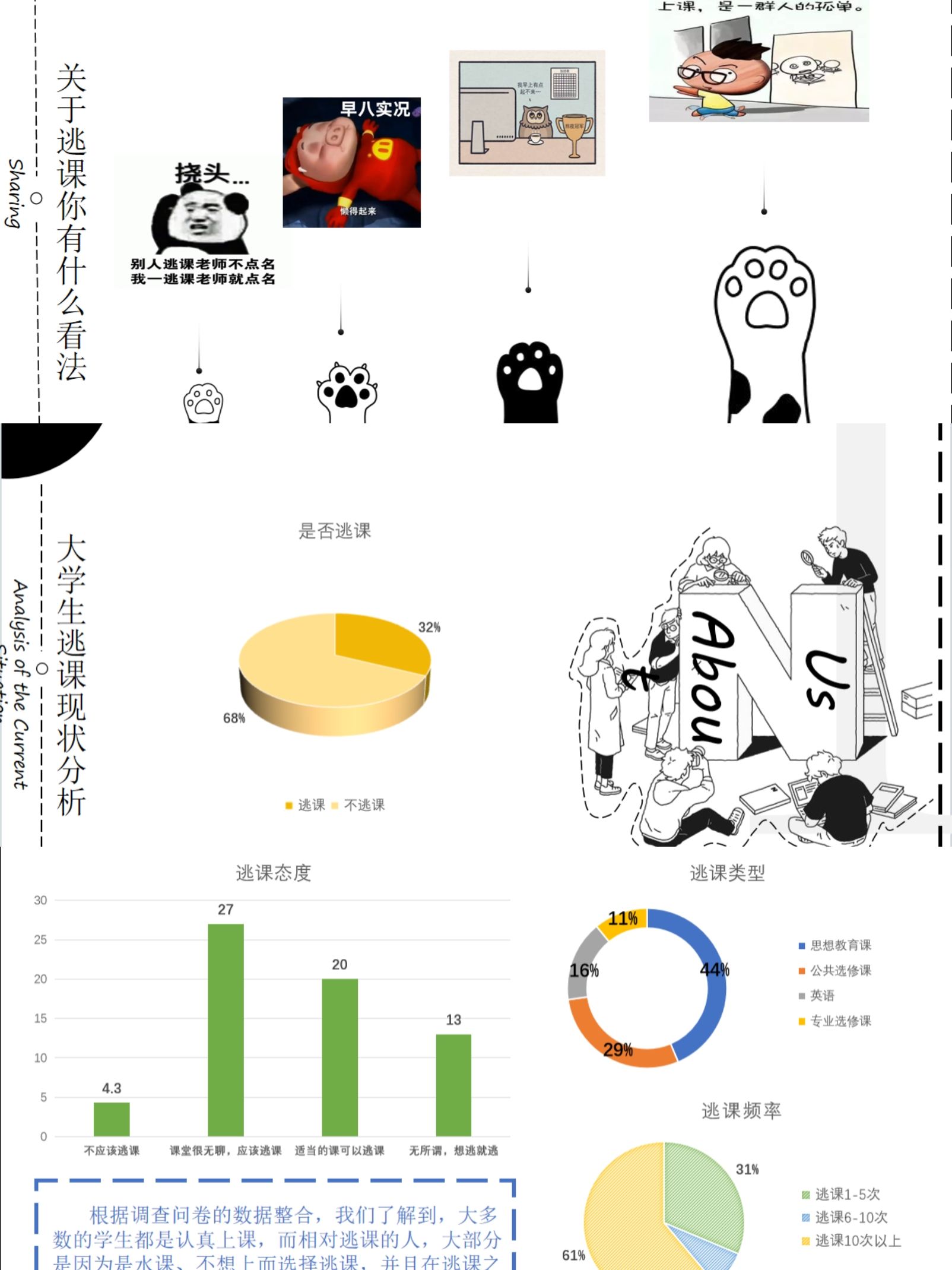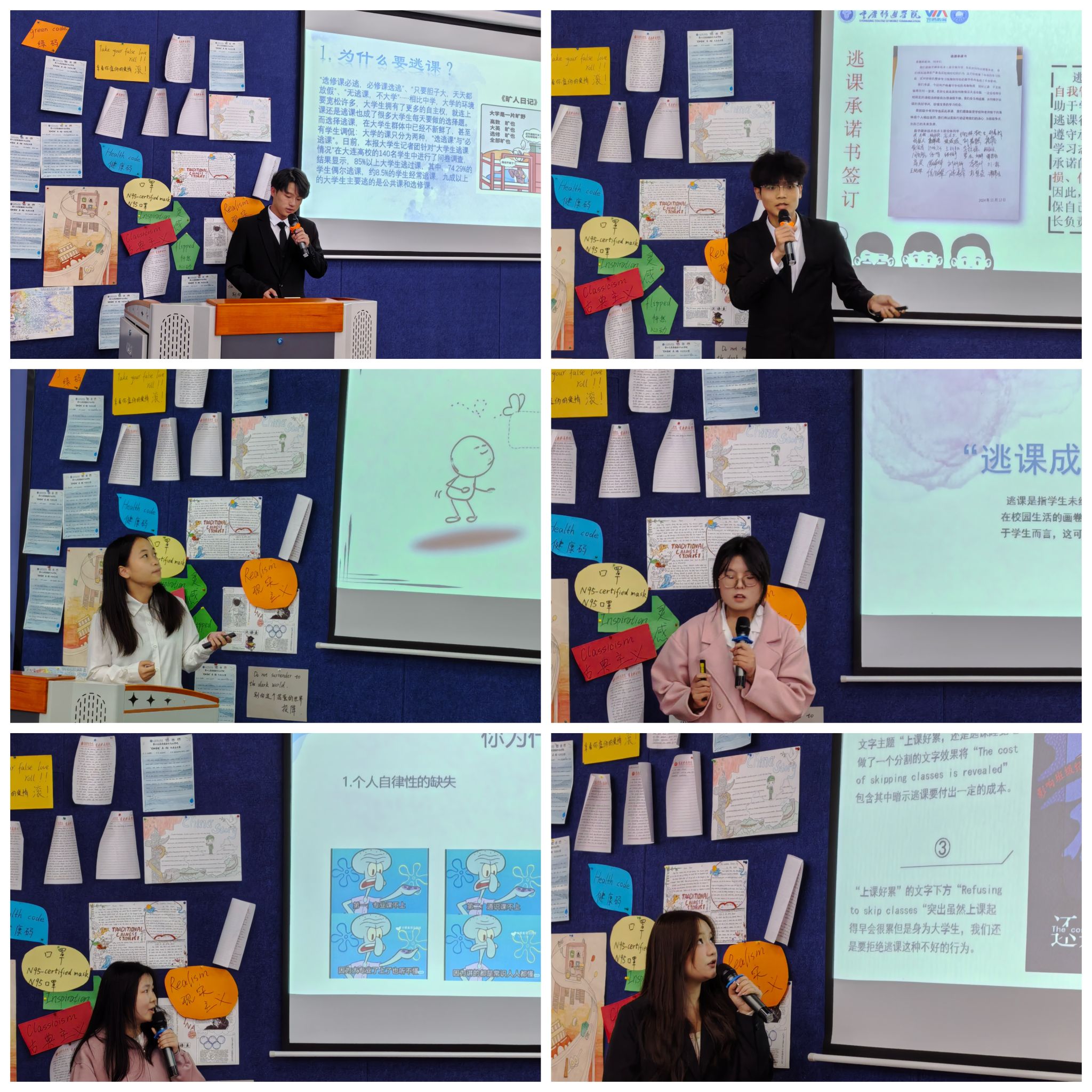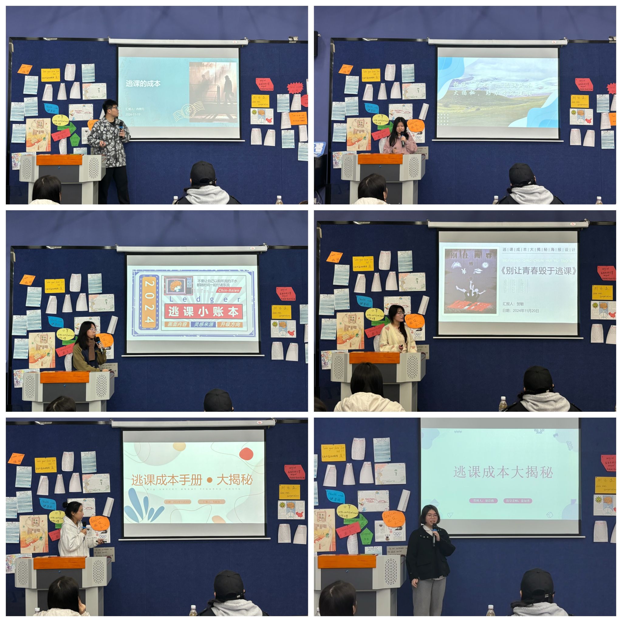 初赛以线上征集形式开展,汇聚20多支队伍的逃课成本账作品。各队深入挖掘逃课的代价,结合自身学习过程与班级的主题班会活动,切身体验地进行了对大学生逃课成本账的作品创作,以海报、微电影、漫画、手册等形式生动呈现。经严谨评审,12支队伍凭借深刻内容、创新思维与精妙设计脱颖而出,晋级决赛,在现场展现更精彩的答辩风采。