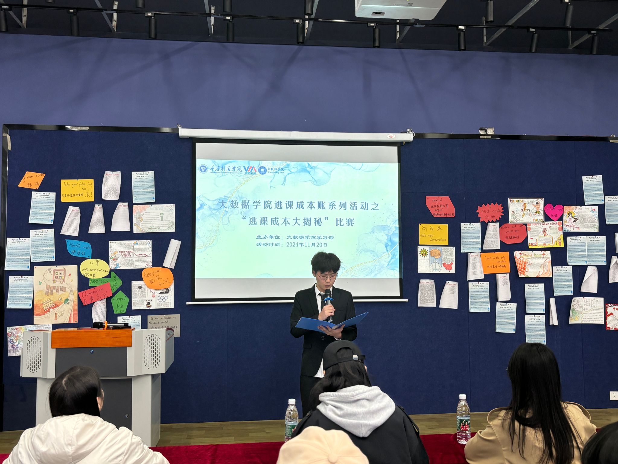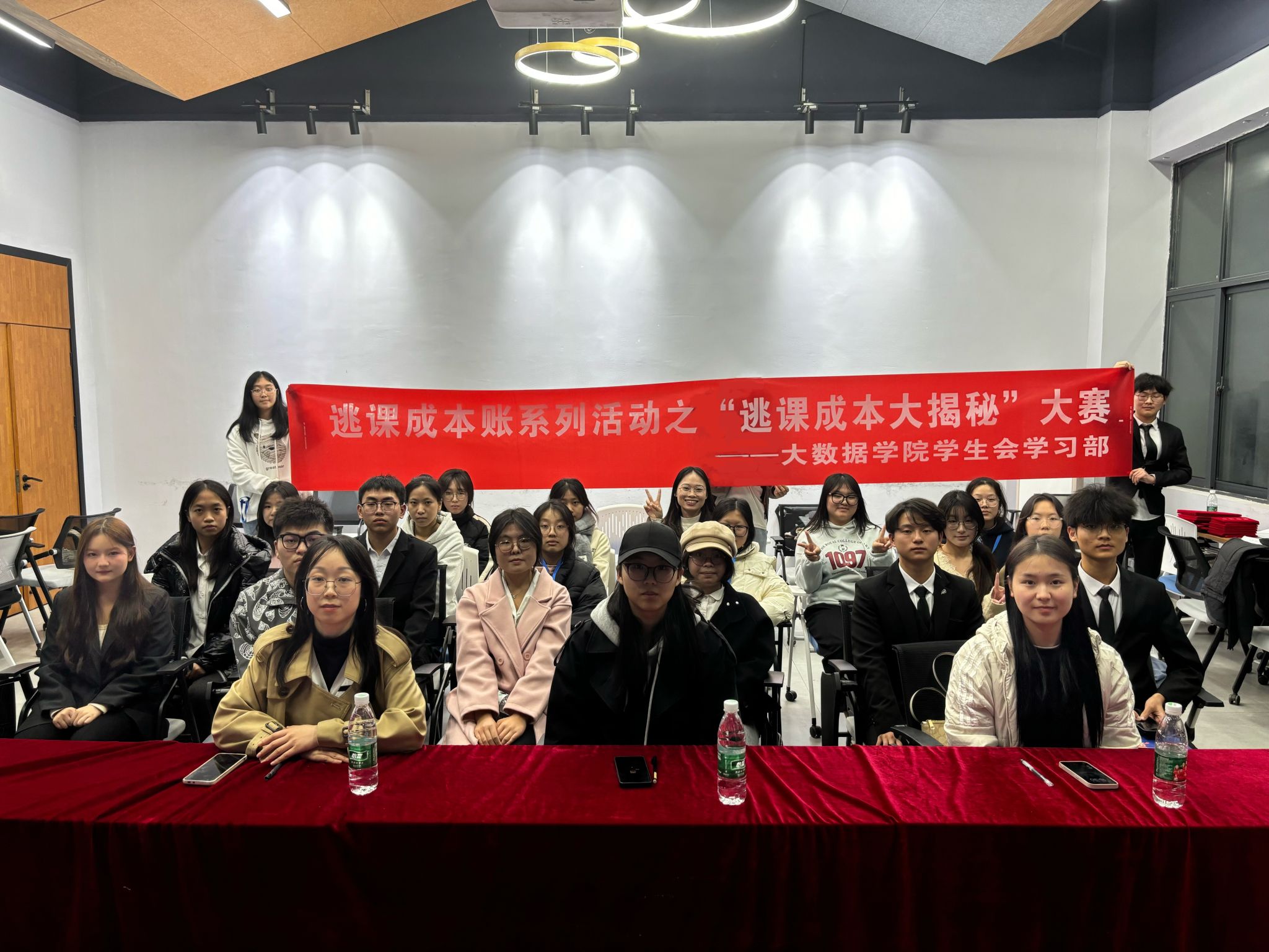 为提升学生时间管理能力,强化学业规划意识,营造积极向上的优良学风,大数据学院于11月20日17:00至18:30,在綦河书院二号楼两句·演讲培训室举办逃课成本账系列活动之“逃课成本账大揭秘”比赛决赛,致力于为同学们的成长提供有力支持,全力打造有助于提升学习效率的良好氛围。